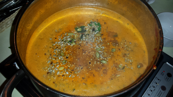 Składniki: 5 pomidorów, 1/3 kostki masła, krzaczek bazylii, 2-3 ząbki czosnku, wywar z warzyw, 3 łyżeczki przecieru pomidorowego, prażone pestki dyni i słonecznika, sól, pieprz, oregano.