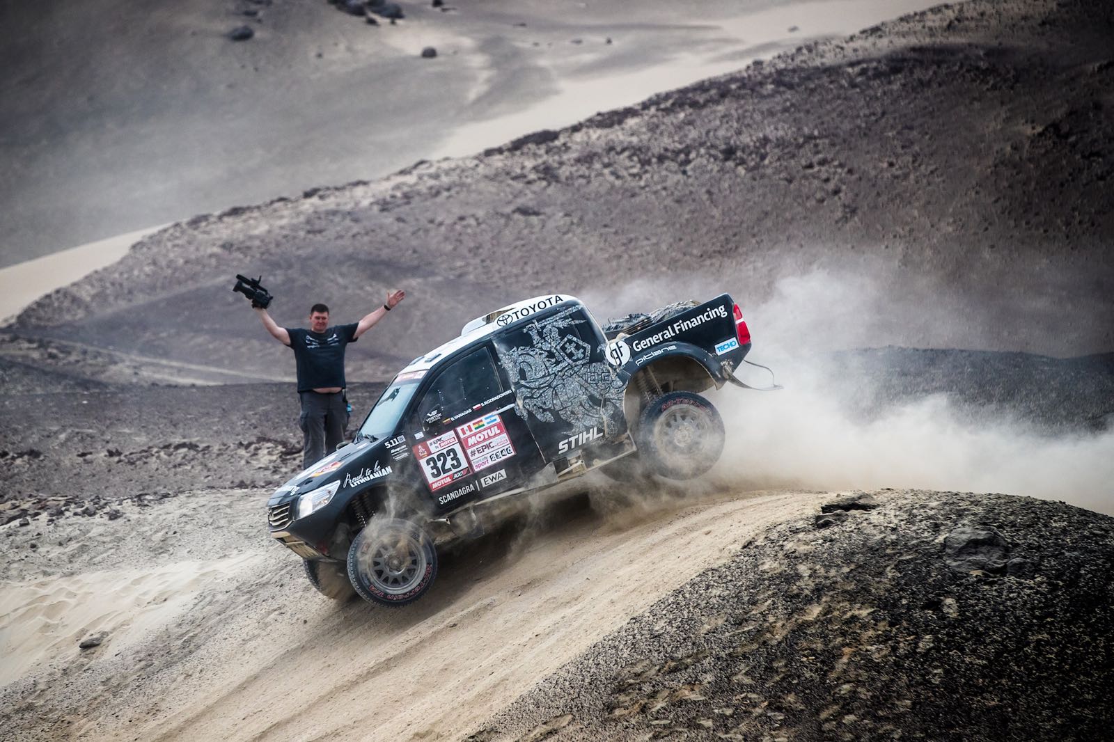 Po sobotnim ostrzeżeniu, kiedy to Toyota Hilux odmówiła posłuszeństwa na 2 km przed metą i potrzebna była interwencja ciężarówki serwisowej, można było spodziewać się płynnej jazdy i odrabiania strat. Niestety – tuż przed drugim punktem pomiaru czasu, załoga straciła kolejne cenne minuty. Sytuacja wyjaśniła się po kilku godzinach, kiedy to Benediktas Vanagas opublikował film z… dachowania na trasie. Samochód po wyprzedzeniu innego auta spadł z wydmy i przekoziołkował. Efektem był jedynie kilkudziesięciominutowy postój i… strata przedniej szyby. „Nie próbujcie tego w domu” – napisał żartobliwie na Instagramie litewski kierowca.