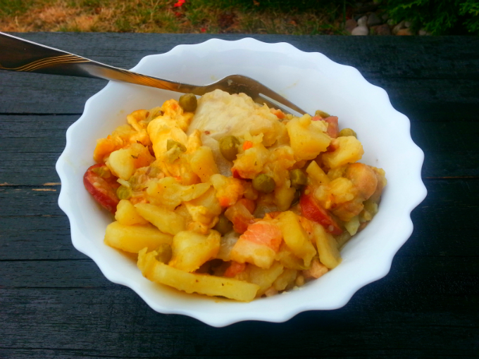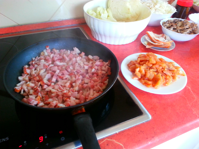 Składniki: ziemniaki, boczek wędzony, kiełbasa, mięso np. z kurczaka, cebula, pieczarki, groszek konserwowy, główka kapusty, ser żółty i przyprawy: sól, pieprz, wegeta, pieprz cayenne, kminek, listek laurowy.
