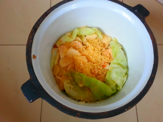 Ziemniaki obrać i pokroić w talarki. Przysmażyć: boczek, kiełbaskę, mięso, pieczarki i cebulę (dwa ostatnie składniki przyprawić solą lub wegetą i pieprzem). Dno kociołka wyłożyć skórką od boczku, by zapobiec przypaleniu. Następnie dno i brzegi kociołka wykładać liśćmi zblanszowanej kapusty. Pierwsza warstwa to ziemniaki, które należy przyprawić solą, pieprzem cayenne i listkiem laurowym. Posypać małą ilością startego sera. Następnie układać w kolejności warstwy: kiełbasy, pieczarek, cebuli, boczku, mięsa, groszku i sera i znowu ziemniaki itd… Aż do wyczerpania składników lub miejsca w kociołku. Z wierzchu posypujemy obficie startym żółtym serem, całość przykrywamy liśćmi kapusty i posypujemy kminkiem, pamiętając o listku laurowym. Zamykamy wieczko kociołka i stawiamy w ognisku, najlepiej na żarze z brykietów lub węgla drzewnego. Po ok. 1,5 godziny sprawdzamy czy ziemniaki są miękkie. Jeśli nie to zamykamy i dopiekamy.