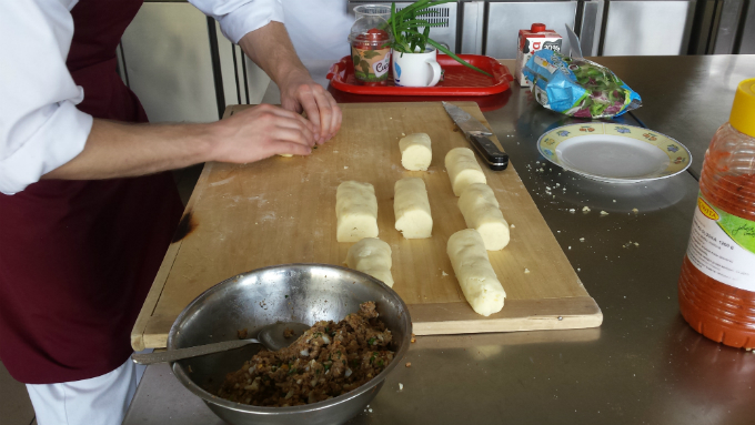 Jesień to dobry czas na wykopki. Na rynku pojawiają się różne odmiany ziemniaków. A popularny kartofel to przecież król naszej kuchni. Tradycyjna kuchnia mazurska zna wiele sposobów w jaki można przygotować to pyszne warzywo. Tym razem podpatrzyłam przy pracy uczniów Zespołu Szkół Gastronomiczno-Spożywczych w Olsztynie. Pretekstem był konkurs wewnętrzny na najlepszą potrawę, przyrządzoną ze starych warmińskich przepisów. Zwyciężyło danie: Farszynki mazurskie, a przyrządził je zespół, składający się z Krystiana Konieczka i Dawida Kwiatkowskiego. Wtedy byli to drugoklasiści – dziś są uczniami 3 klasy Zespołu Szkół Gastronomiczno-Spożywczych w Olsztynie.