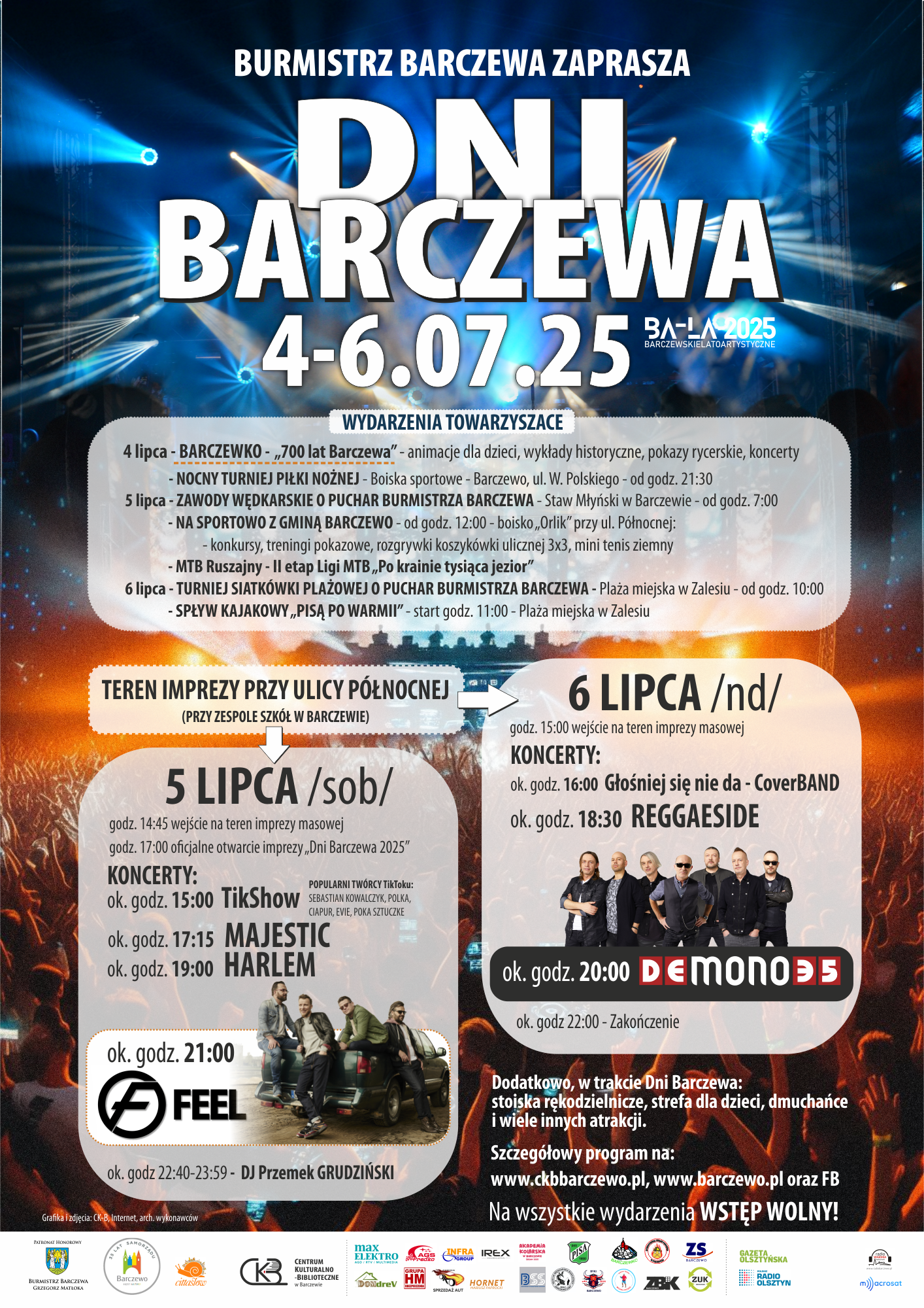 Główna scena wydarzeń muzycznych znajdzie się na terenie przy Zespole Szkół w Barczewie (ul. Północna). W sobotę, 5 lipca, o godz. 14:45 ruszy strefa koncertowa. Na scenie pojawią się m.in. twórcy znani z TikToka – TikShow – a po nich zagrają kolejno: Majestic, rockowy Harlem, a o godz. 21:00 długo wyczekiwany koncert zespołu Feel, znanego z takich hitów jak „Jak anioła głos” czy „Pokaż na co cię stać”. Taneczne zakończenie wieczoru zapewni DJ Przemek Grudziński.