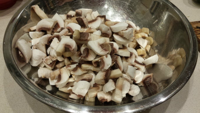 Składniki: makaron gryczany (rurki), pieczarki, cukinia, cebula, czosnek, pierś z kurczaka, ser mozzarella, śmietana, oliwa i przyprawy: ostra papryka, sól i pieprz.