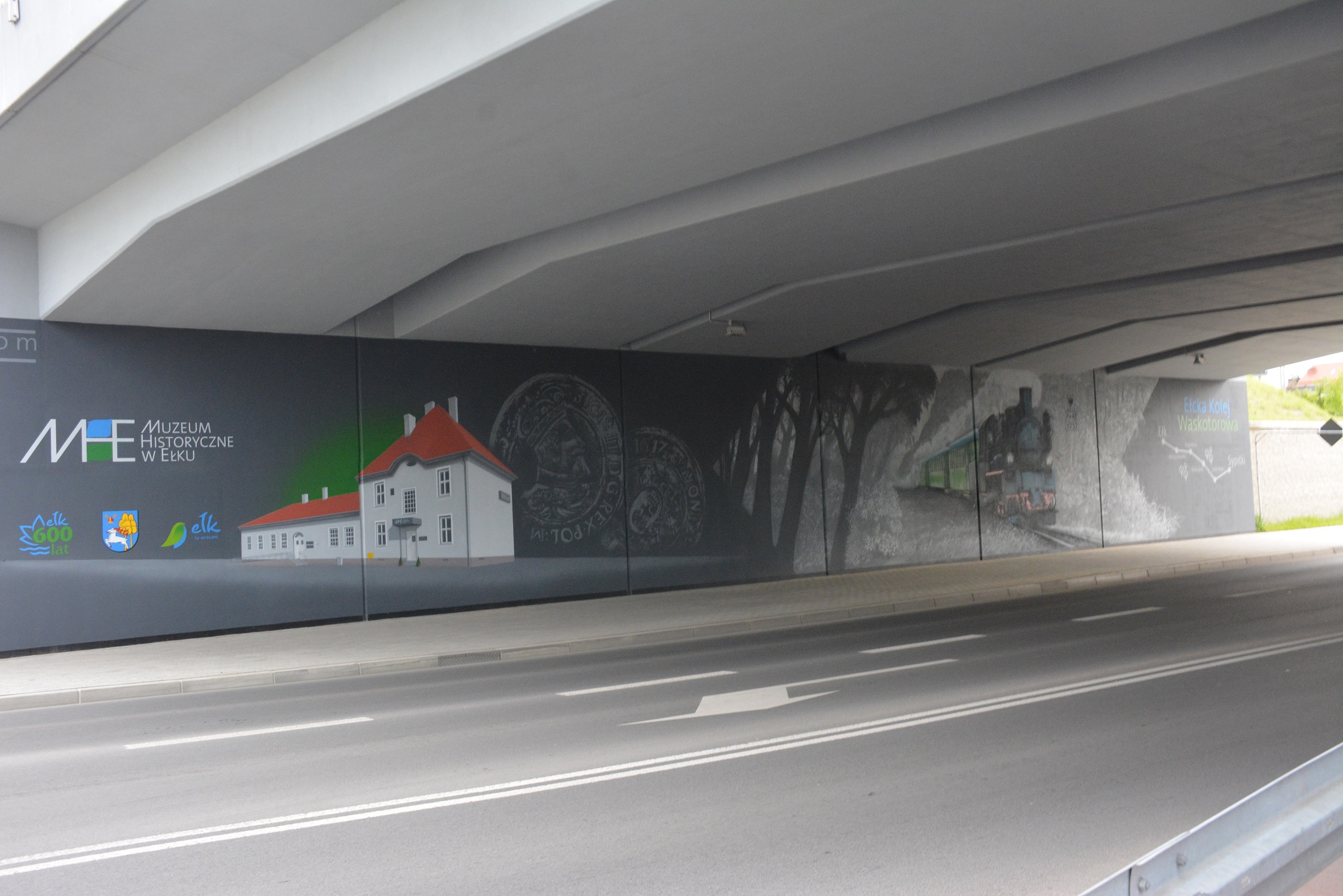 Są to w zasadzie dwa murale, bo znajdują się po obu stronach wiaduktu. Jeden od strony ulicy Dąbrowskiej przekierowuje do muzeum i przedstawia jego budynek. Malowidło po drugiej stronie nawiązuje do kolei. Ten mural to uczczenie 600-lecia lokacji Ełku