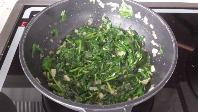 Szpinak umyć, cebulę pokroić w drobną kostkę, a czosnek w plastry. Przesmażyć na maśle. Dodać szpinak, doprawić solą i pieprzem. Gotowe potrawy skomponować na talerzu w sposób estetyczny, wskazany na zdjęciu z dekoracją świeżych ziół i limonki.