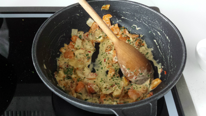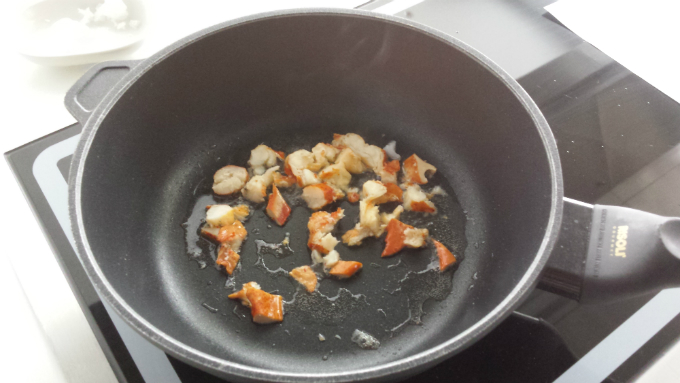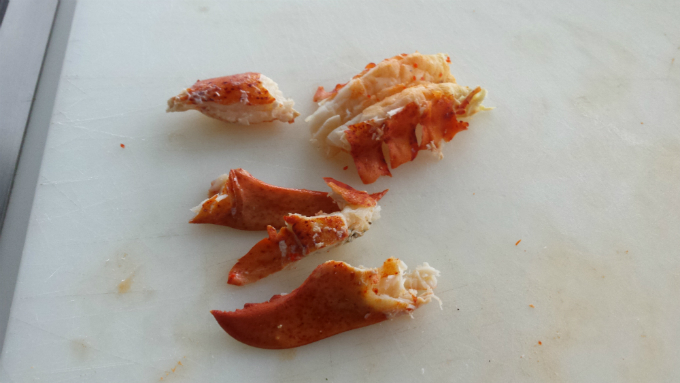 Homary (żywe) ugotować we wrzątku z dodatkiem masła, soli, czosnku i świeżego kopru. Ostudzić i wyjąć mięso ze szczypców i odwłoka. Pokroić w plastry. Ugotować wywar warzywny z marchwi i selera. Na patelni rozgrzać masło kokosowe, przesmażyć homary, dodając warzywa z wywaru – marchew i seler pokrojone w plastry. Następnie dodać trochę wina białego i zredukować. Doprawić do smaku solą, pieprzem, skropić limonka, dodać pokrojoną w cząstki papryczkę chili. Podlać wywarem i gotować 15-20 min., dodając śmietanę. Zmniejszyć moc grzania i doprowadzić do redukcji śmietany. Posiekać całą miętę z krzaczka i dodać do potrawki.