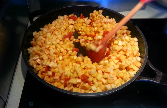 Jabłka pokroić w kosteczkę i uprażyć w karmelu z dodatkiem masła, miodu i cynamonu. W połowie smażenia wrzucić rozmoczone rodzynki. Ciasto robimy z twarogu, do którego dodajemy przesianą mąkę, żółtka, cukier, startą skórkę pomarańczy lub cytryny, cukier waniliowy. Całość delikatnie mieszamy. Wystudzone jabłka łączymy z ciastem i dodajemy pianę z białek. Smażymy placuszki na klarowanym maśle lub oleju. Posypujemy cukrem pudrem.