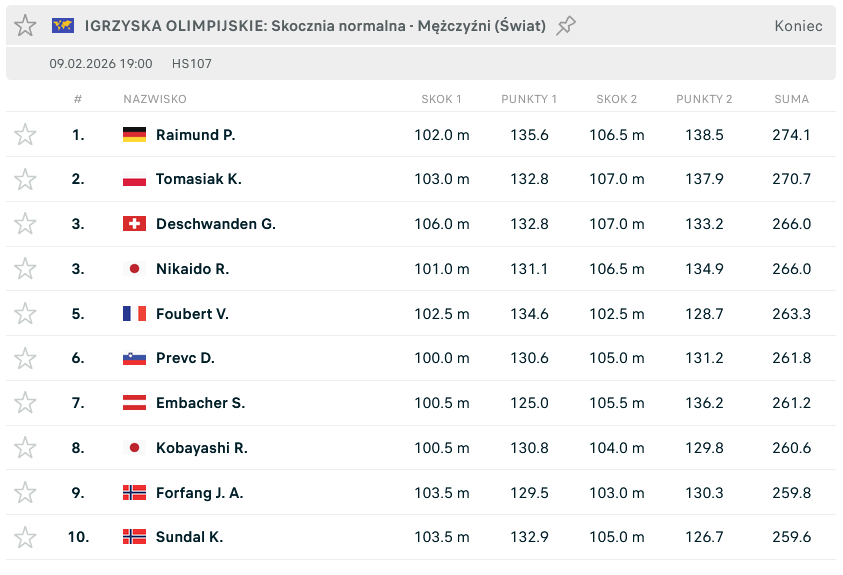 Po brąz sięgnęli ex aequo Japończyk Ren Nikaido i Szwajcar Gregor Deschwanden. To pierwsze podium biało-czerwonych na igrzyskach Mediolan-Cortina d’Ampezzo.