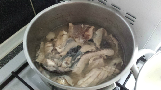 Składniki: karp, agar (zamiast żelatyny), rodzynki, jajka, migdały, mleko, wino słodkie Muskat, likier gruszkowy, niebieski barwnik spożywczy, kolendra, trawa cytrynowa, cytryna lub limonka, liść laurowy, ziele angielskie, sól i pieprz, cukier i wykałaczki.