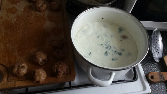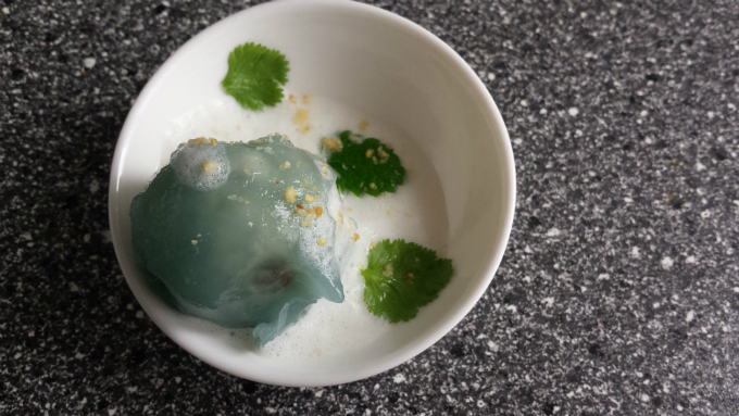 Karpia obrać ze skóry, wyfiletować z ości. Ugotować wywar na łbie, skórach i ości z dodatkiem wina Muskat i odrobiny likieru gruszkowego, liścia laurowego i ziela angielskiego. Można docukrzyć do smaku (nie solić i nie pieprzyć). Przygotować agar mieszając według instrukcji z wywarem i barwnikiem spożywczym. Mięso z karpia posiekać lub zmielić, dodając namoczone rodzynki, uprażone starte migdały, żółtko i ubite na pianę białko. Doprawić solą i pieprzem. Uformować pulpety i gotować przez 5-6 minut w mleku z dodatkiem trawy cytrynowej. Wystudzić i nabić każdy pulpet wykałaczką. Dwukrotnie moczyć w agarze w odstępach ok. 5 minut. Nabijać np. na styropian do stężenia agaru. Mleko pozostałe po gotowaniu pulpetów ubić na piankę. Serwować w małej kokilce. Każdą kulkę „opatulić” pianką z mleka dekorując listkami kolendry. Posypać kruszonymi migdałami i startą skórką cytryny lub limonki.