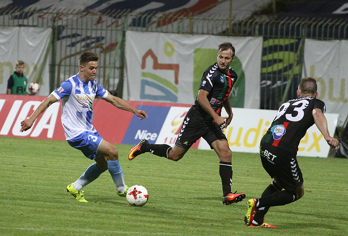 Mecz Stomil Olsztyn – GKS Tychy. Przy piłce strzelec pierwszego gola, Grzegorz Lech. Fot. A.Szczepański