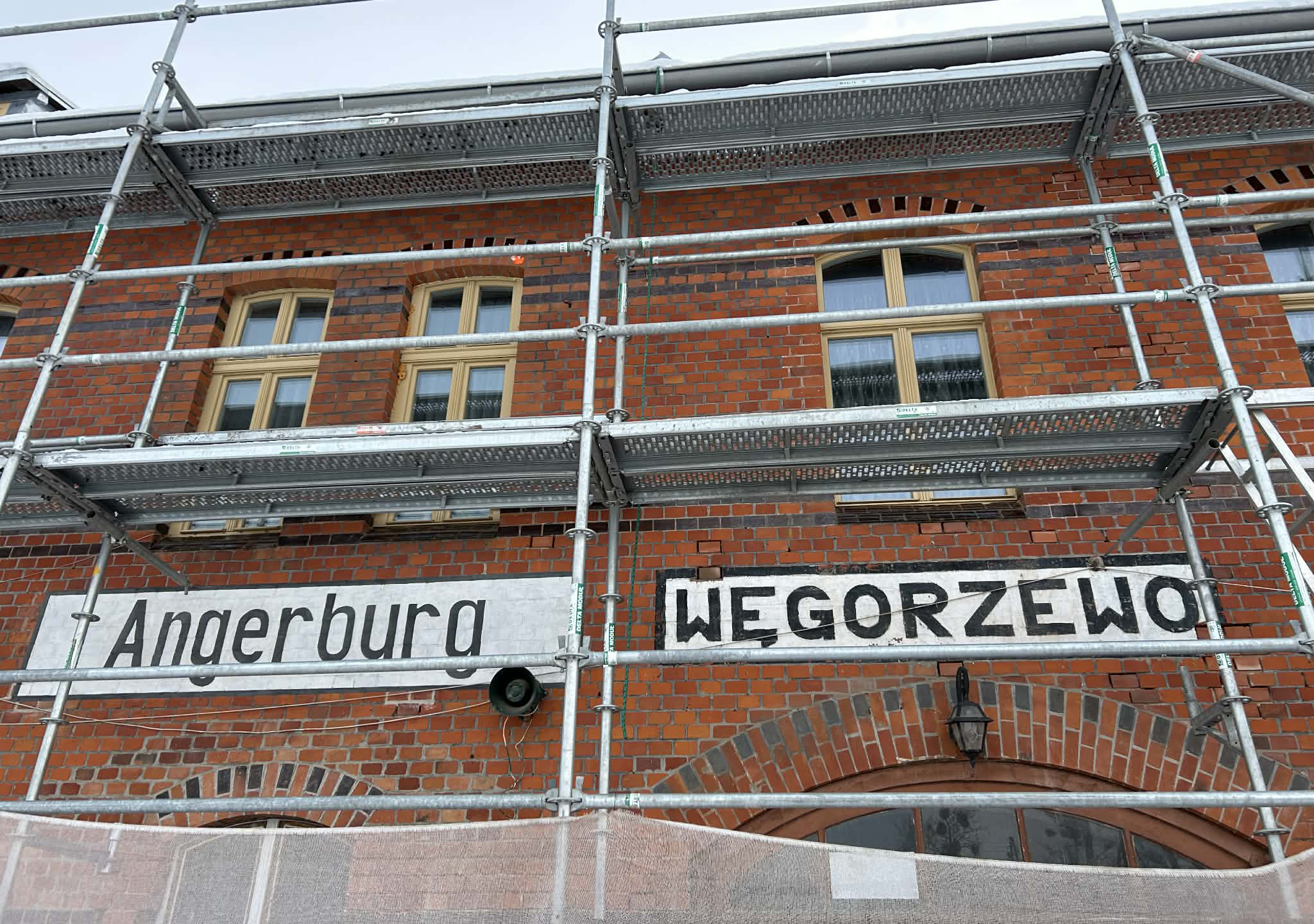 Przykładem ekspansji języka niemieckiego w naszym regionie jest dworzec w Węgorzewie. Za nami znajduje się napis Angerburg, która to nazwa niemiecka, pruska pojawiła się w niedawnym czasie na elewacji dworca