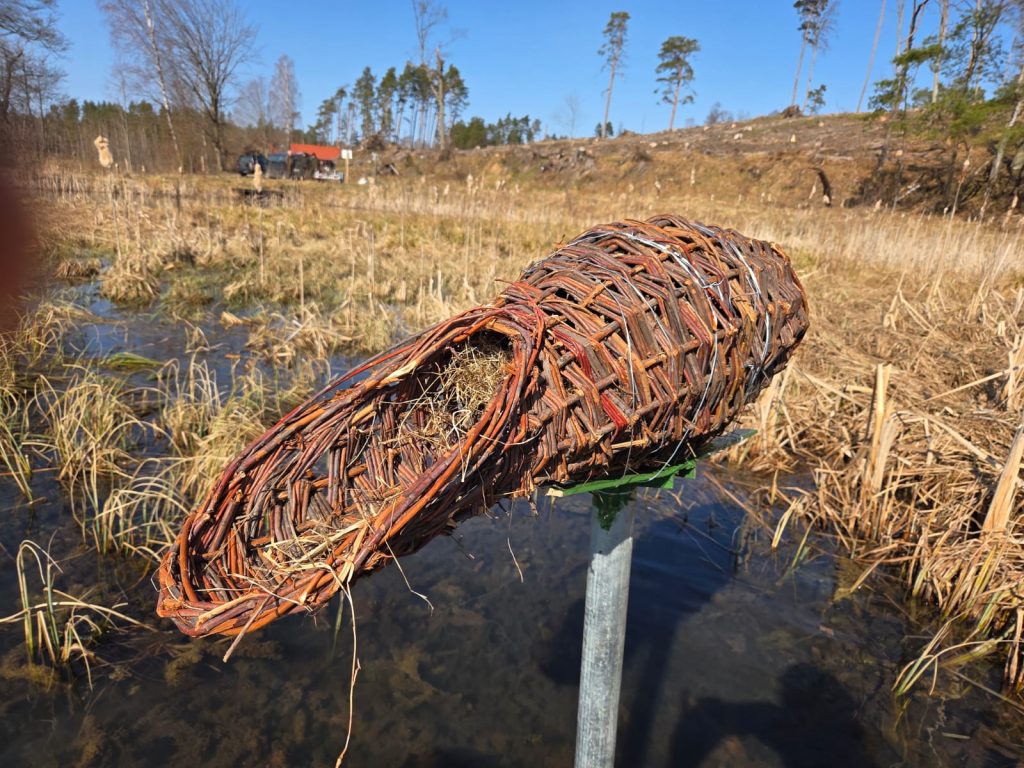 Kosze lęgowe wykonane są z naturalnych materiałów – głównie wikliny, drewna i roślinnej wyściółki. Konstrukcje wtapiają się w otoczenie i zapewniają ptakom odpowiednie warunki do wychowu młodych.