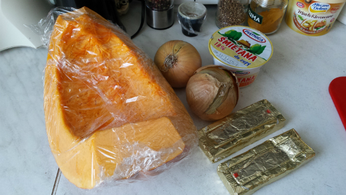 Składniki: 1,5 kg dyni, 2 cebule, 2 serki topione – śmietankowe, wywar warzywny z kawałka selera, 2 marchewek, 1 pietruszki i 2 kostek rosołowych, prażone pestki dyni, kminek mielony, kolendra, kurkuma w proszku i w kulkach, gałka muszkatołowa, sól, pieprz, ziele angielskie, klarowane masło, śmietana 18%.