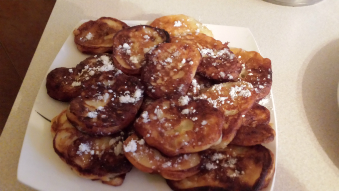 Racuchy: utrzeć mąkę z jogurtem, cukrem, szczyptą soli i żółtkami. Ubić pianę z białek i połączyć z ciastem. Wkroić jabłka i banany. Smażyć na oleju. Do ciasta można dodać trochę octu, by nie piło oleju. Podawać z cukrem pudrem lub konfiturami.