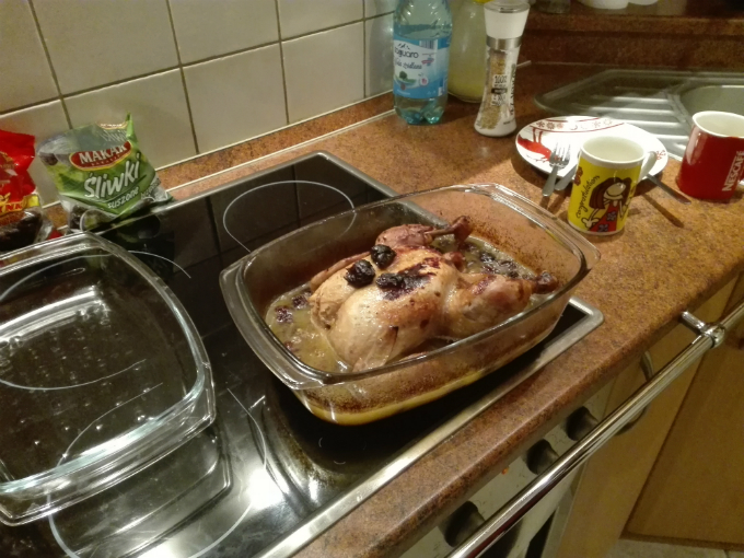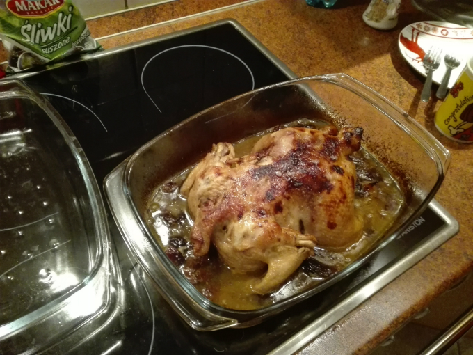 Składniki: cały kurczak, kostka masła, bulion, śliwki suszone, rodzynki, oliwa, sól i pieprz.