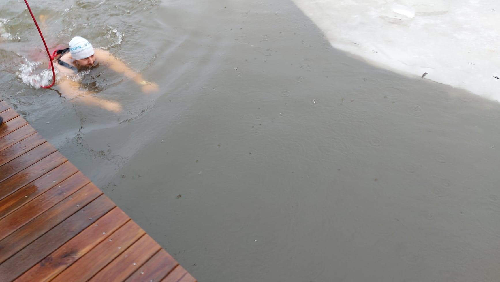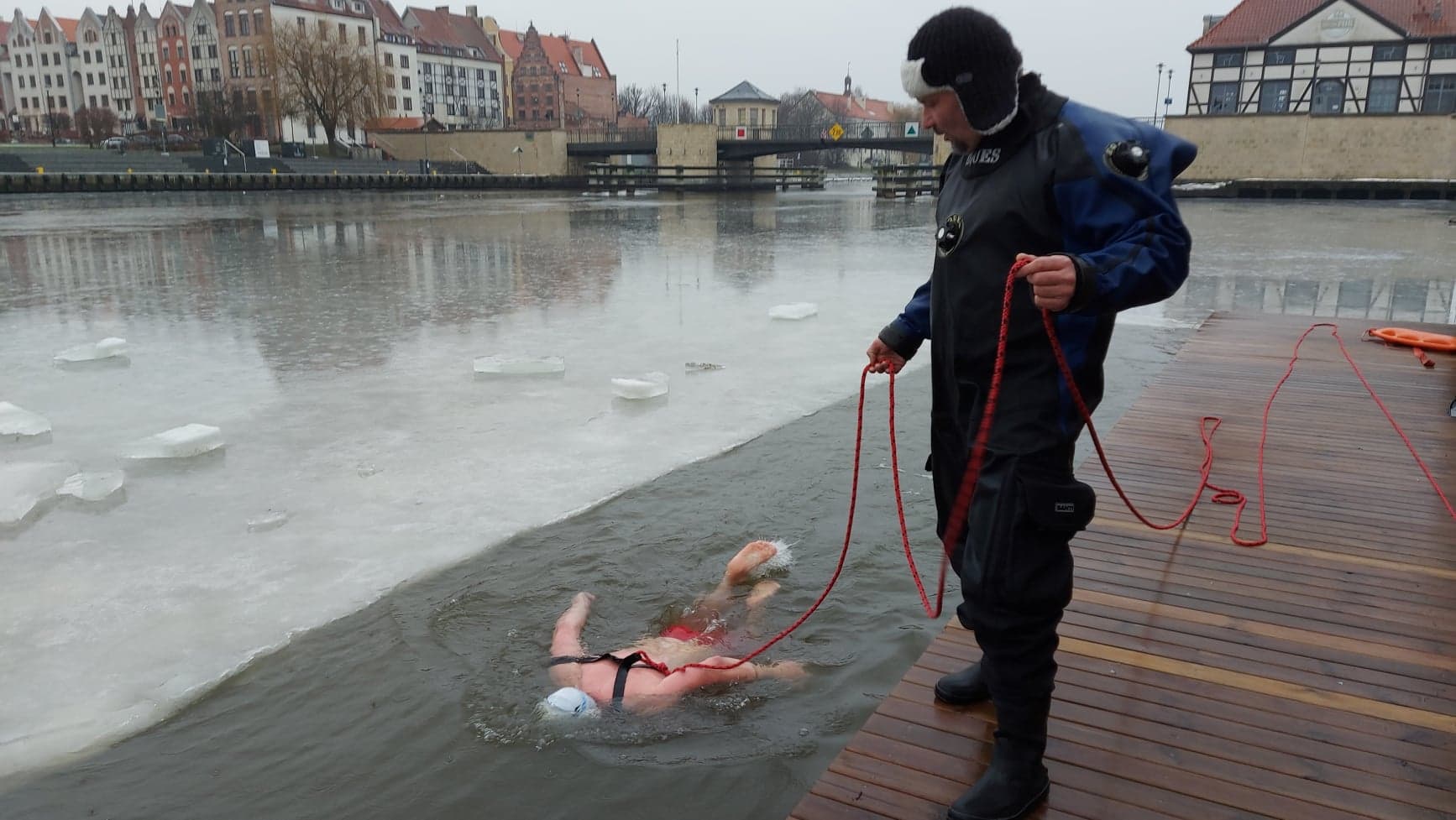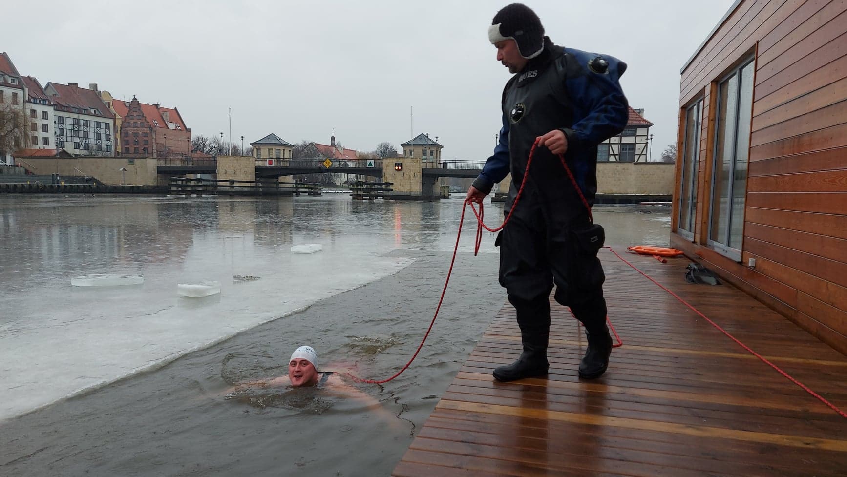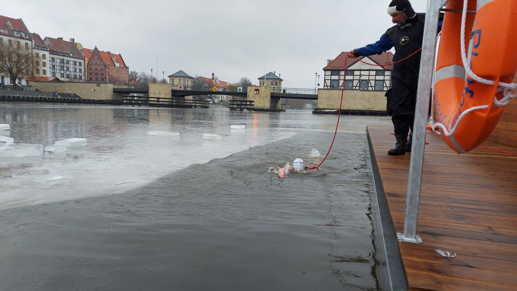 Lodowe pływanie pod okiem wicemistrza świata. Na kąpiel w rzece Elbląg potrzebna była zgoda Urzędu Morskiego w Gdyni