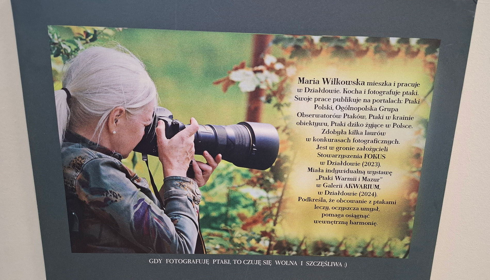 Czy przyroda może nas uczyć szczęścia? Pani Maria Wilkowska jest tego pewna. Zaczęło się od zdjęć ptaków robionych przez szybę w czasach pandemii. Dziś bohaterka reportażu jest autorką kilku wystaw fotograficznych.