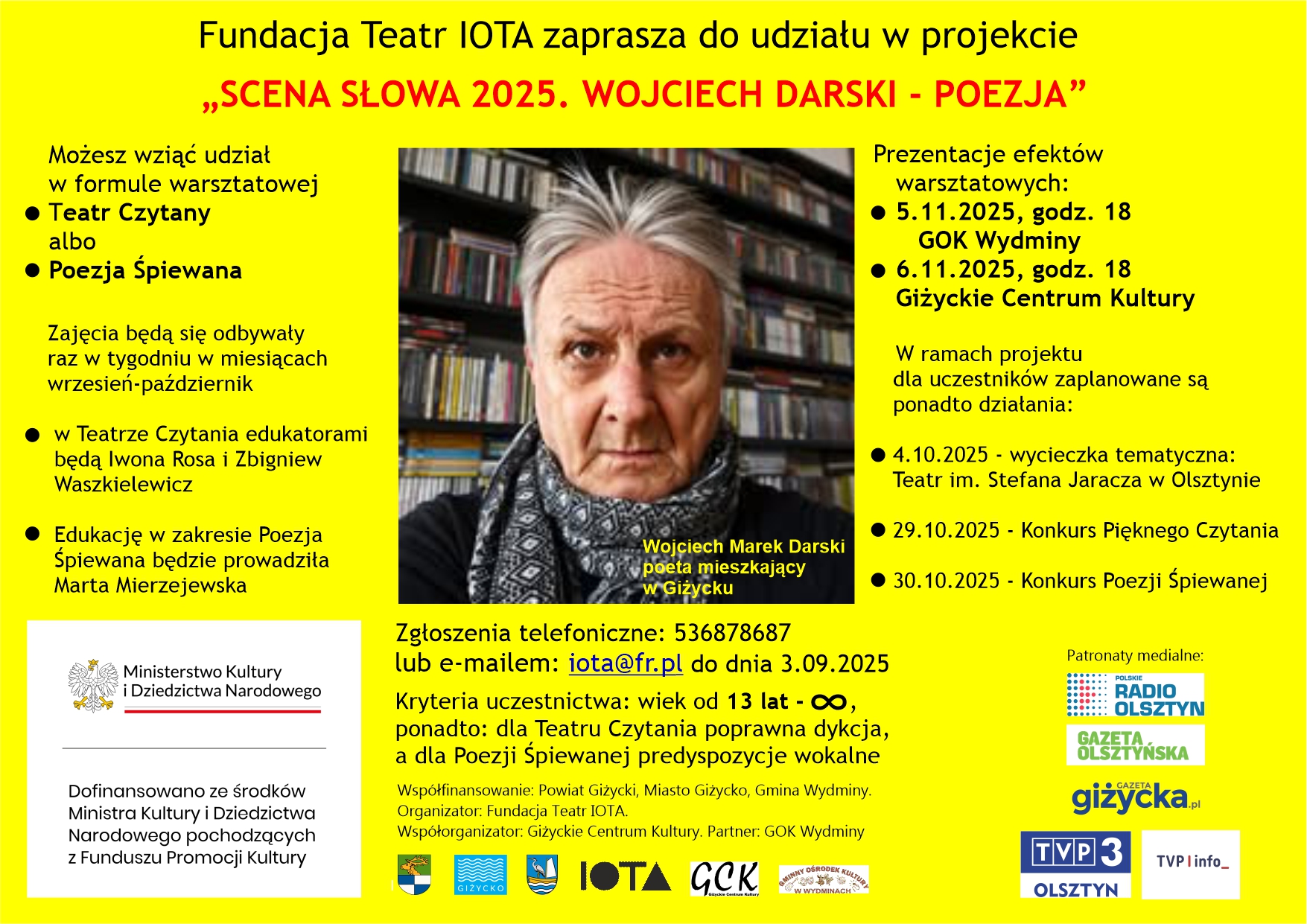 Fundacja Teatr IOTA rozpoczyna nabór do projektu „Scena Słowa 2025. Wojciech Darski – Poezja”, którego uczestnicy będą mieli okazję rozwijać swoje umiejętności w formule warsztatowej – do wyboru Teatr Czytany lub Poezja Śpiewana.
