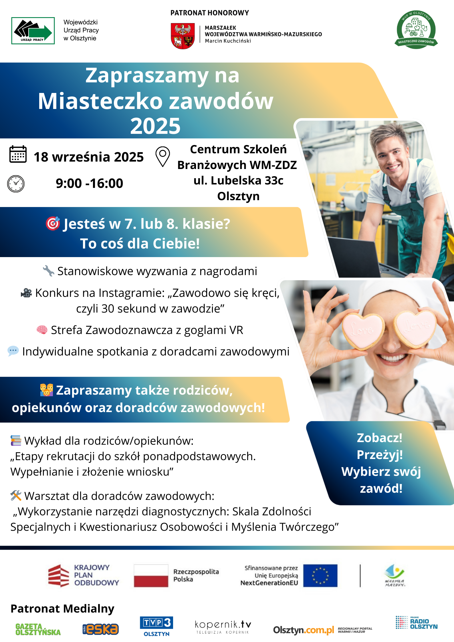 Organizatorzy przewidzieli także propozycje dla rodziców i nauczycieli. Przedstawiciel Kuratorium Oświaty w Olsztynie poprowadzi wykład „Etapy rekrutacji do szkół ponadpodstawowych”, natomiast dla doradców zawodowych i pedagogów odbędą się warsztaty poświęcone wykorzystaniu narzędzi diagnostycznych w pracy z młodzieżą.