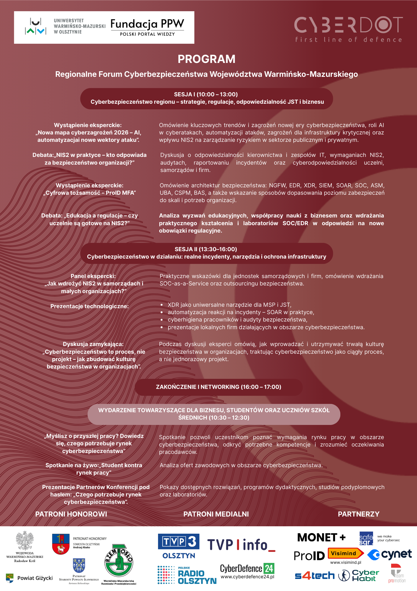 Rosnąca liczba cyberzagrożeń, nowe obowiązki wynikające z Dyrektywy NIS2 oraz coraz większa zależność instytucji od systemów cyfrowych sprawiają, że cyberbezpieczeństwo przestaje być domeną informatyków, a staje się realnym wyzwaniem dla administracji, biznesu i edukacji. Odpowiedzią na te potrzeby jest myCyberDot – Regionalne Forum Cyberbezpieczeństwa Województwa Warmińsko-Mazurskiego, które odbędzie się 11 lutego 2026 roku.