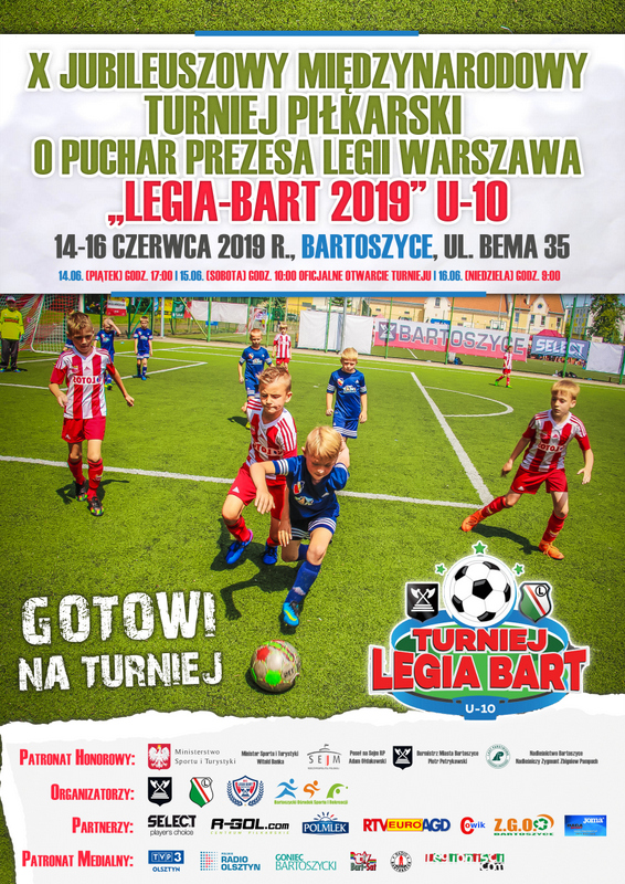 Już w czerwcu wielkie futbolowe emocje z udziałem klubów piłkarskich z całego kraju oraz zagranicy. Wszystko za sprawą 10. jubileuszowej edycji Międzynarodowego Turnieju Piłkarskiego o Puchar Prezesa Legia Warszawa Legia Bart 2019 U-10. Na orliku w Bartoszycach zagrają 10-letni zawodnicy z 16 drużyn z Polski, Niemiec, Łotwy, Litwy, Rosji, Ukrainy i Nigerii.