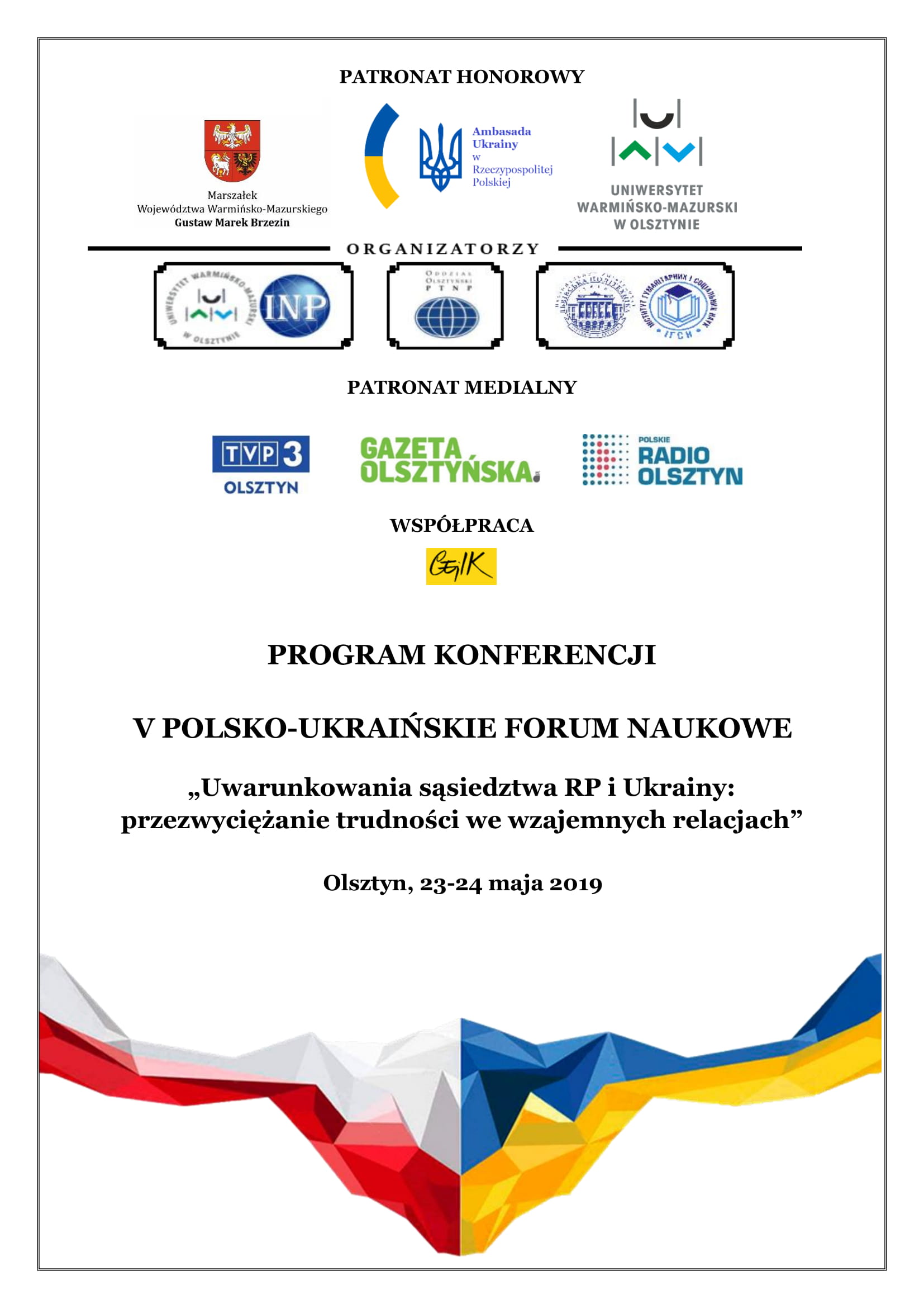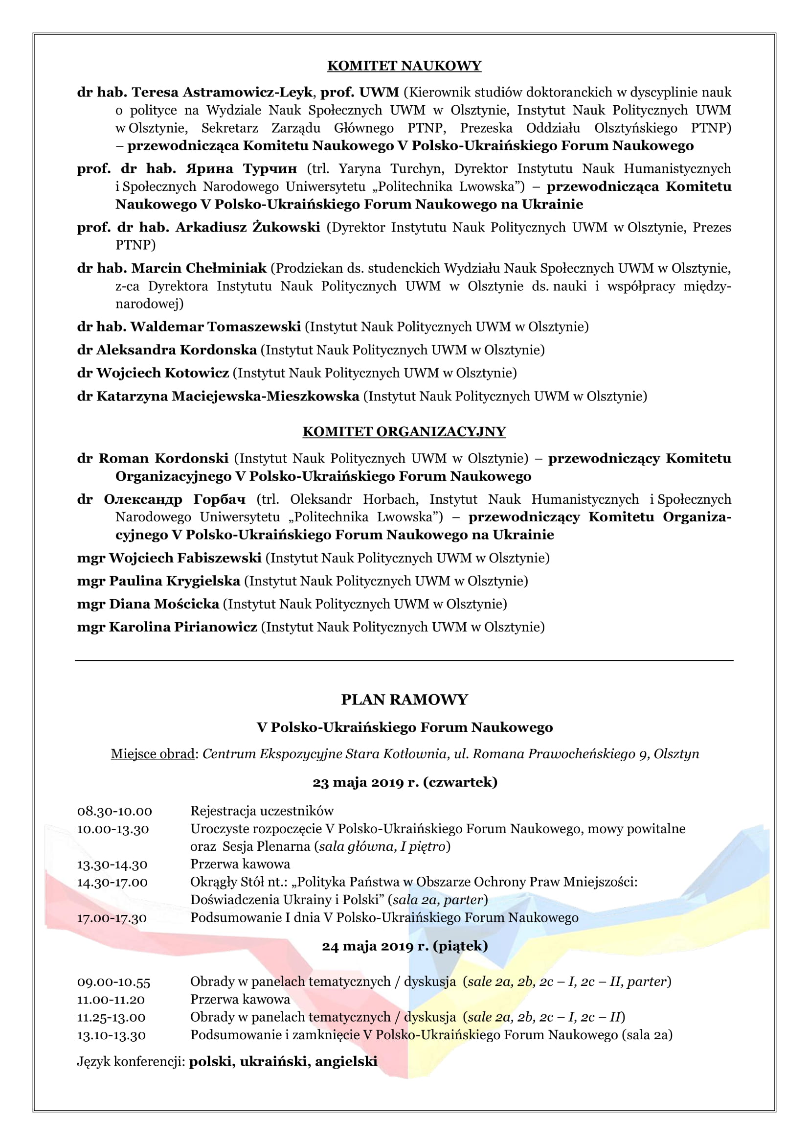 V Polsko-Ukraińskie Forum Naukowe jest kontynuacją współpracy międzynarodowej w ramach porozumienia podpisanego pomiędzy Instytutem Nauk Politycznych UWM a Instytutem Nauk Humanistycznych i Społecznych Uniwersytetu Narodowego „Politechnika Lwowska”. To międzynarodowe spotkanie dotyczyć będzie problematyki stosunków polsko-ukraińskich i kwestii integracji europejskiej. W ramach Forum odbędzie się Sesja Plenarna i Okrągły Stół, poświęcone polityce państwa wobec mniejszości narodowych w Polsce i na Ukrainie. Jak podkreślają organizatorzy, będzie to również dobra okazja do dyskusji na tematy aktualnie nurtujące polskich i ukraińskich obywateli, a także do prognozowania przyszłych scenariuszy dla Polski i Ukrainy, w tym dotyczących dalszych relacji obu krajów.