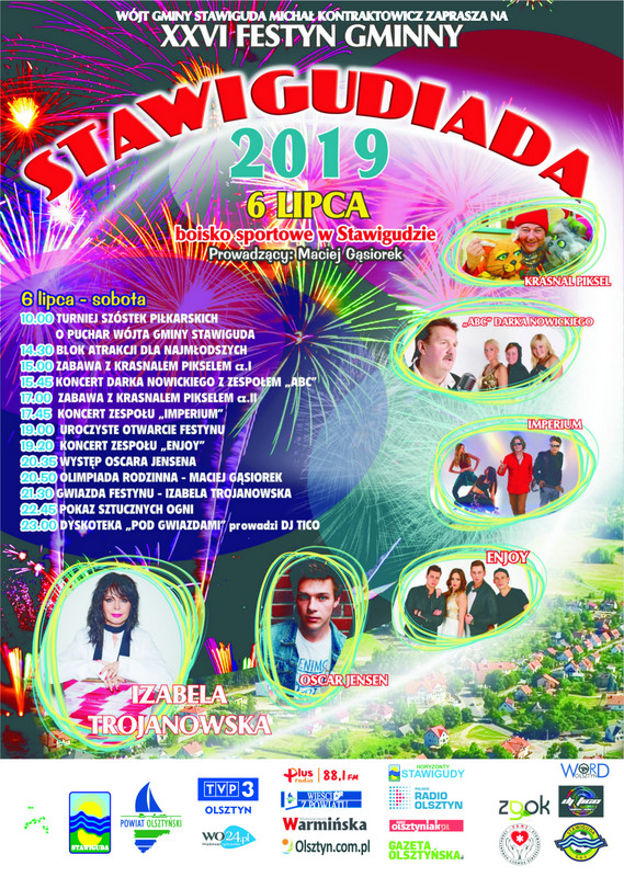 Gmina Stawiguda, Starostwo Powiatowe w Olsztynie i Gminny Ośrodek Kultury w Stawigudzie zapraszają j na 26 edycję Festynu Gminnego „Stawigudiada 2019”, który odbywa się nieprzerwanie od 1994 roku. Organizatorzy zapewniają, że i tym razem nie zabraknie wspaniałej zabawy, dobrej muzyki i pozytywnej atmosfery. Gwiazdą tegorocznej imprezy będzie Izabela Trojanowska, która swoje dzieciństwo i młodość spędziła w Olsztynie.
