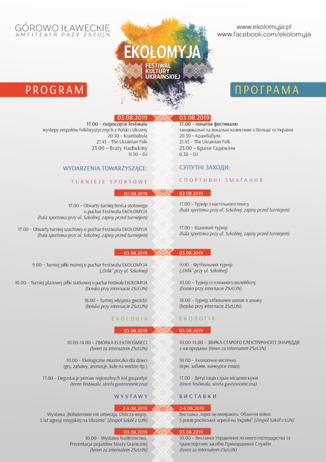 Stowarzyszenie Środkowo – Europejskie Centrum Szkolenia Młodzieży w Górowie Iławeckim już po raz jedenasty organizuje festiwal „EKOŁOMYJA”, który odbywa się w Górowie Iławeckim. Festiwal wspiera rozwój kultury ukraińskiej, integrując jednocześnie społeczeństwo Warmii i Mazur. Jak co roku, oprócz licznych koncertów, na festiwalu realizowane będą zagadnienia o tematyce ekologicznej, a jed-nym z nich będzie zbiórka elektrośmieci. Nie zabraknie również stoisk z regionalnymi potrawami przy-gotowanych przez koła gospodyń wiejskich oraz rozgrywek sportowych.