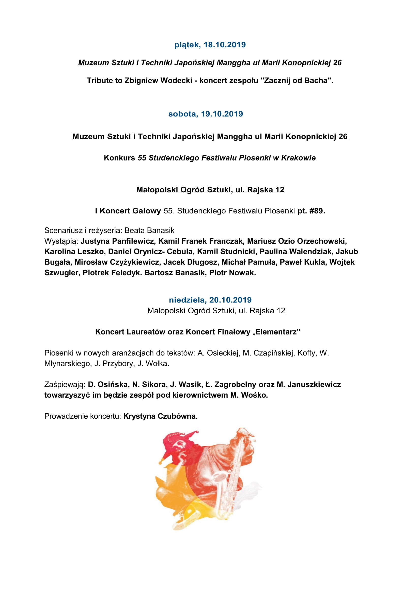 Jubileuszowy, 55. Studencki Festiwal Piosenki w Krakowie to połączenie znakomitej tradycji i ogólnopolskiej renomy artystycznej z ideą promowania nowoczesnej, posiadającej wysokie walory artystyczne polskiej twórczości wykonawców-debiutantów. Od 1962 roku, Studencki Festiwal Piosenki jest jednym z najważniejszych festiwali piosenki artystycznej i zaangażowanej na terenie całego kraju.