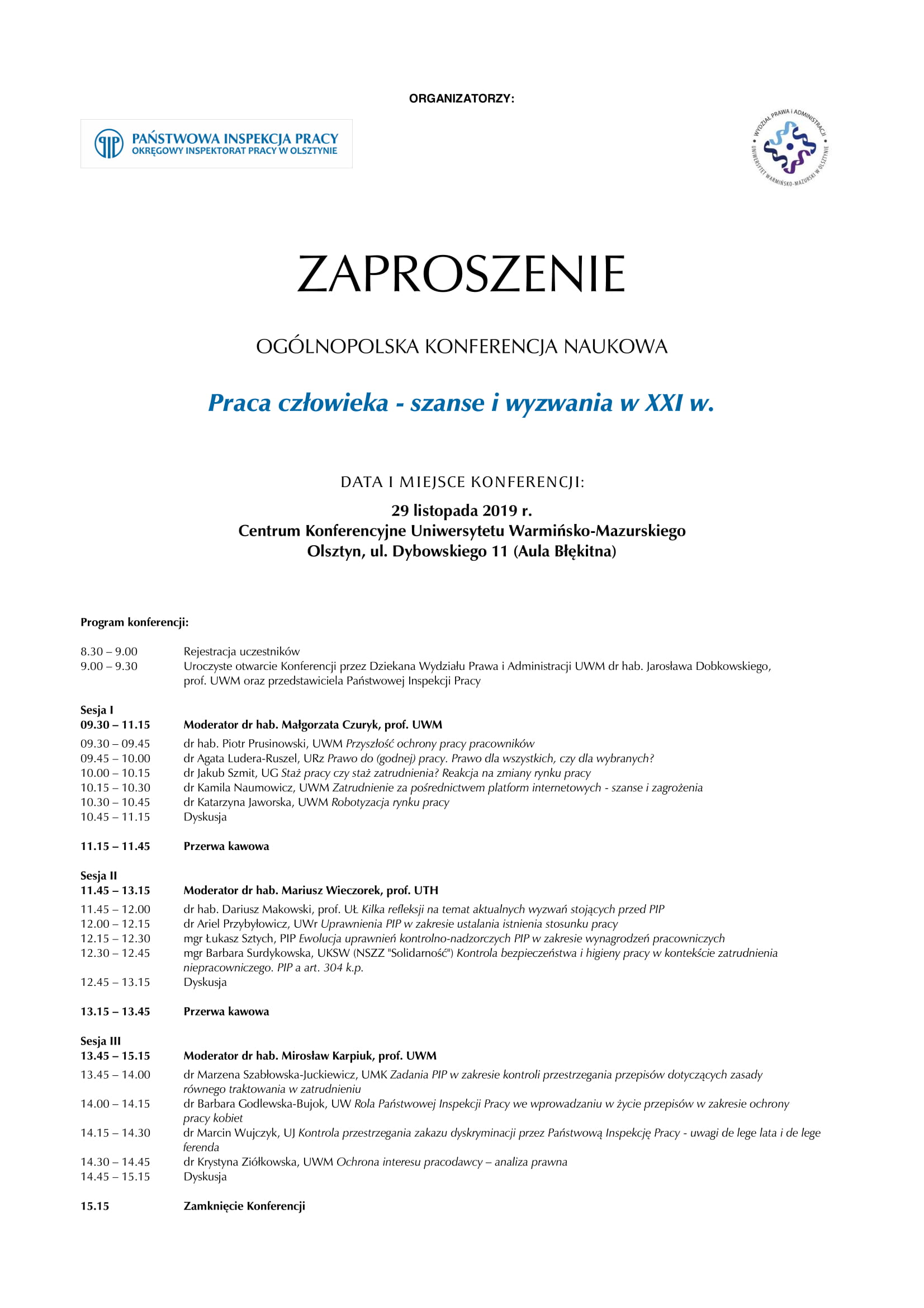 Państwowa Inspekcja Pracy - Inspektorat Okręgowy w Olsztynie oraz Wydział Prawa i Administracji Uniwersytetu Warmińsko-Mazurskiego w Olsztynie zapraszają na ogólnopolską konferencję naukową poświęconą problematyce szans i wyzwań dla pracy człowieka w XXI w.