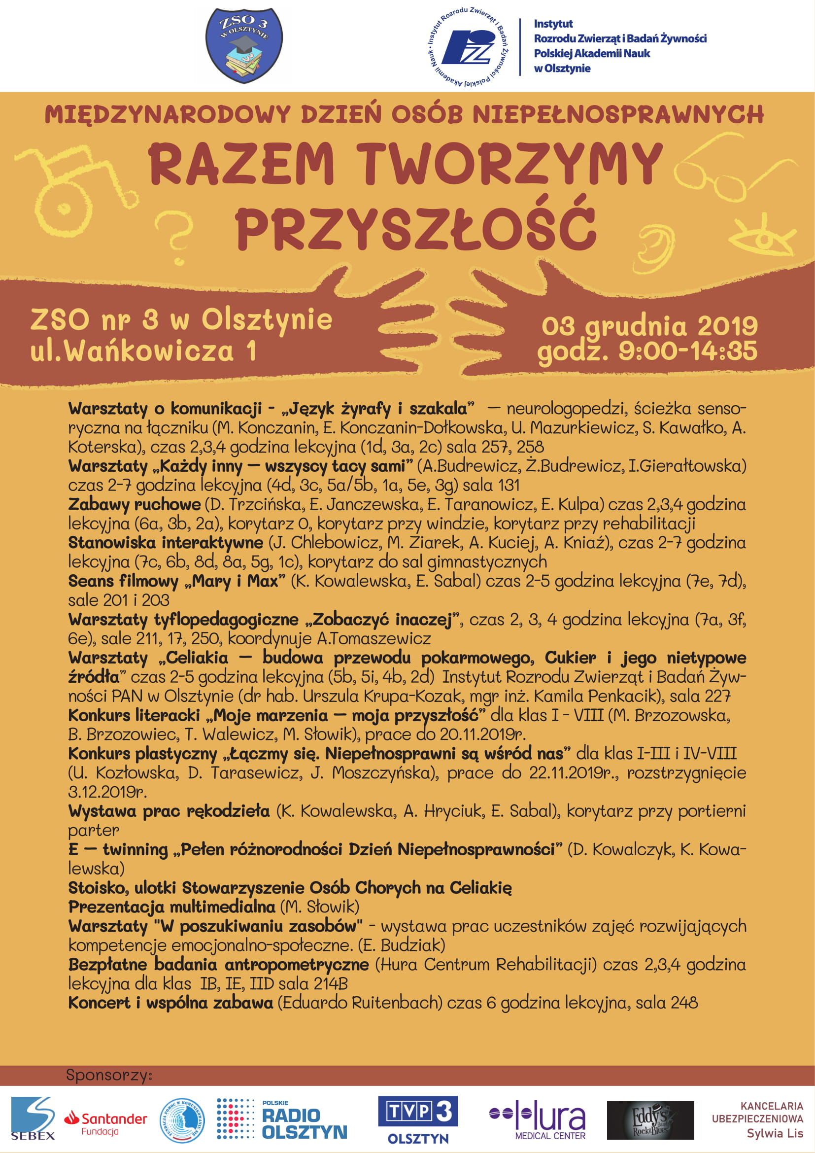 Celem obchodów jest przybliżenie społeczeństwu problemów osób niepełnosprawnych, czyli tych u których występują ograniczenia w prawidłowym funkcjonowaniu spowodowane obniżeniem sprawności fizycznej lub psychicznej, albo nieprawidłowości w budowie i funkcjonowaniu organizmu, oraz pomoc we włączeniu tej grupy społecznej w społeczne życie. Obchody Dnia są również okazją do zwiększenia świadomości publicznej o korzyściach płynących z integracji osób niepełnosprawnych w każdym aspekcie życia politycznego, społecznego, gospodarczego i kulturalnego. Ważną tematyką obchodów jest integracja środowiska lokalnego, szkolnego. Celem corocznych obchodów jest upowszechnianie idei tolerancji, otwartości i szacunku dla inności, a także ukazanie korzyści płynących z pełnej integracji osób niepełnosprawnych. W placówce organizatora wydarzenia uczą się dzieci i młodzież z niepełnosprawnościami ruchowymi w tym z afazją, słabosłyszące z implantami słuchowymi i aparatami zausznymi, słabowidzące, z autyzmem, z zespołem Aspergera, z niepełnosprawnością sprzężoną oraz licznymi chorobami. W ramach obchodów odbędą się warsztaty, prelekcje, stanowiska interaktywne, pokazy filmowe, zabawy ruchowe, które zostały przygotowane przez zespół specjalistów pracujących w Zespole Szkół Ogólnokształcących nr 3 w Olsztynie. Uczestnicy będą poznawać świat poprzez słowo, dotyk, obraz, smak, dźwięk. Ambasadorem tego dnia będzie Bartosz Sycik z klasy 8a, który od kilku lat aktywnie uczestniczy w audycji radiowej “Dziecinada”.