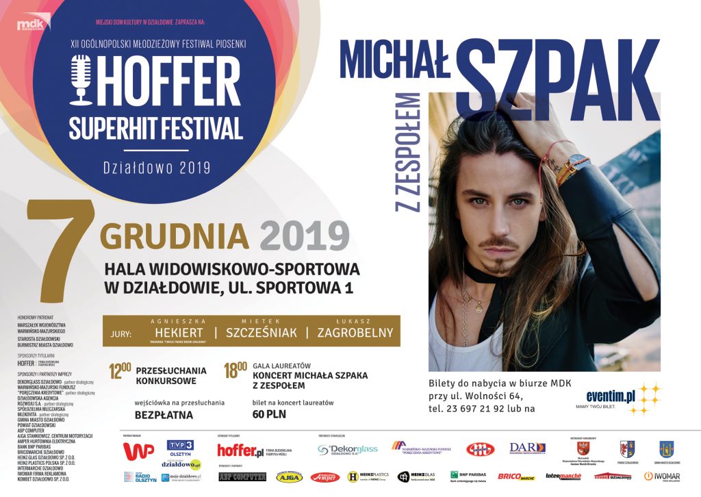 7 grudnia w hali widowiskowo-sportowej przy Szkole Podstawowej nr 2 w Działdowie odbędzie się XII Ogólnopolski Młodzieżowy Festiwal Piosenki Hoffer Superhit Festival Działdowo 2019. Gwiazdą tegorocznego festiwalu będzie Michał Szpak z zespołem.