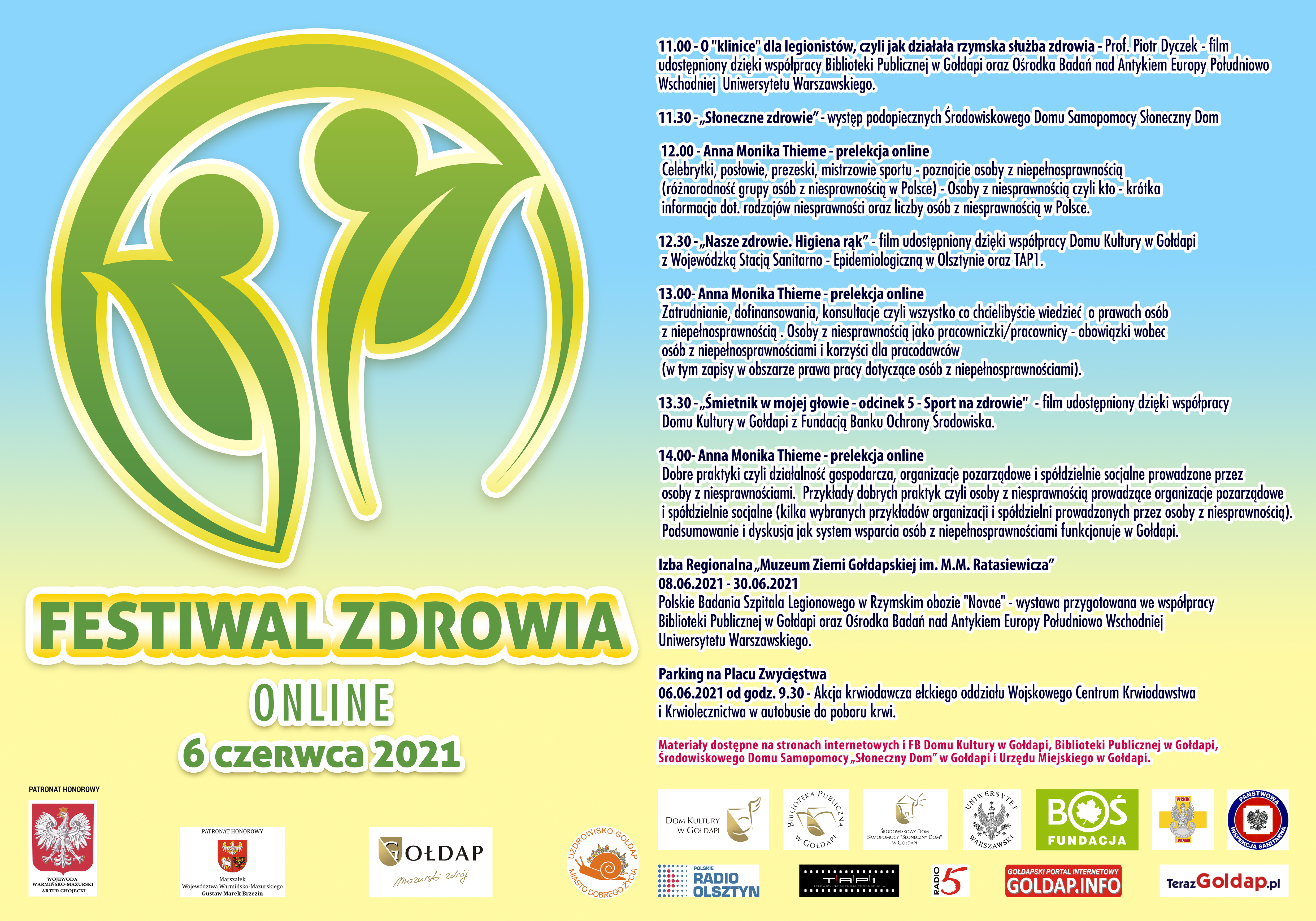 Festiwal Zdrowia to wydarzenie promujące zdrowy styl życia, organizowany w jedynym w województwie warmińsko-mazurskim uzdrowisku Gołdap. Tegoroczna edycja Festiwalu ze względu na obostrzenia epidemiczne odbędzie się online. Organizatorzy przygotowali wirtualną formę festiwalu, podczas której na portalach społecznościowych Urzędu Miejskiego w Gołdapi, Domu Kultury, Biblioteki Publicznej i Środowiskowego Domu Samopomocy „Słoneczny Dom” w Gołdapi odbędą się prezentacje, prelekcje oraz projekcje filmów o tematyce zdrowotnej. Ponadto na Placu Zwycięstwa odbędzie się akcja krwiodawcza, a w Izbie Regionalnej „Muzeum Ziemi Gołdapskiej im. M.M. Ratasiewicza” dostępna będzie od 8 czerwca 2021 r. wystawa pt. Polskie Badania Szpitala Legionowego w Rzymskim obozie „Novae”.