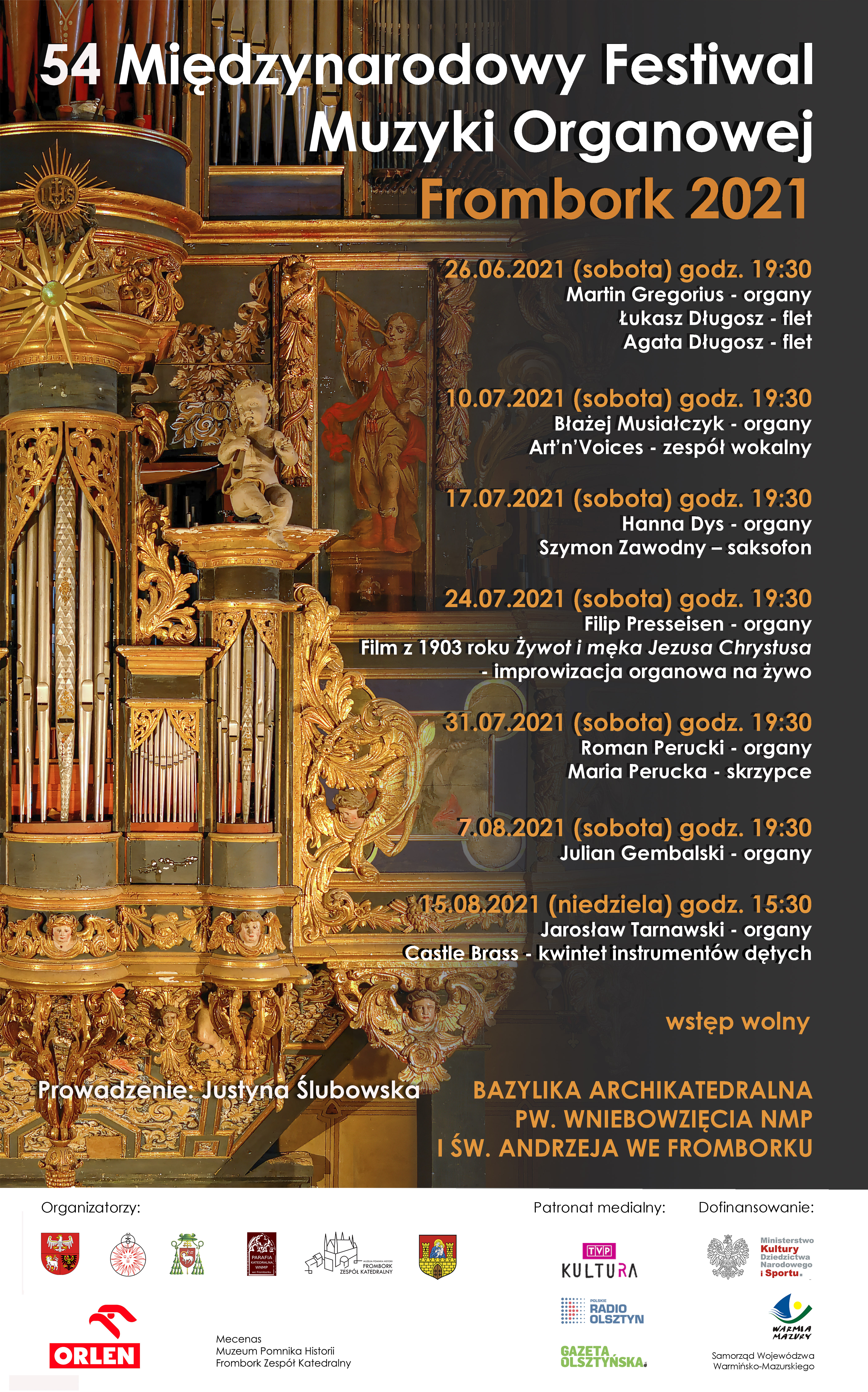 Już 26 czerwca 2021 roku, w bazylice archikatedralnej pw. Wniebowzięcia Najświętszej Maryi Panny i św. Andrzeja we Fromborku rozpocznie się 54. edycja Międzynarodowego Festiwalu Muzyki Organowej we Fromborku. Podczas koncertu wystąpią utytułowani muzycy: organista Martin Gregorius oraz para flecistów: Agata Kielar-Długosz i Łukasz Długosz. Wstęp na wszystkie koncerty festiwalowe jest bezpłatny dzięki dofinansowaniu Ministerstwa Kultury, Dziedzictwa Narodowego i Sportu oraz Samorządu Województwa Warmińsko-Mazurskiego.