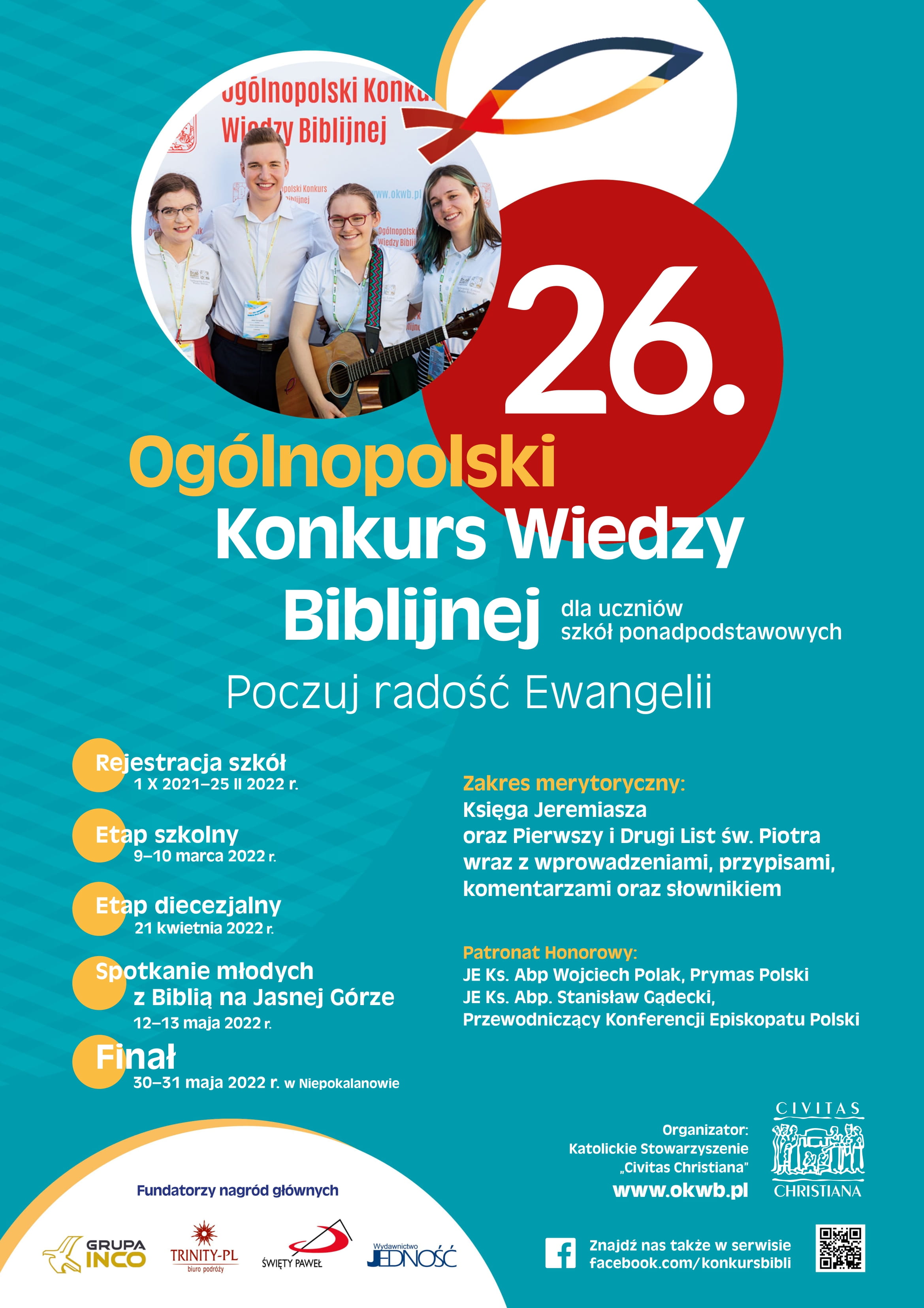 Przed nami 26. edycja Ogólnopolskiego Konkursu Wiedzy Biblijnej dla uczniów szkół ponadpodstawowych, która w tym roku przebiegać będzie pod hasłem "Poczuj radość "Ewangelii".