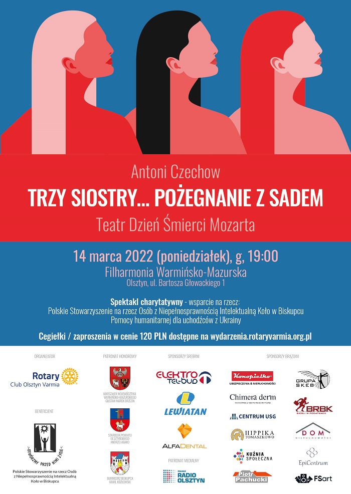 Już 14 marca o godzinie 19.00 w Filharmonii Warmińsko-Mazurskiej niecodzienny spektakl. Na scenie wystąpią aktorzy z Międzynarodowej Grupy Teatralnej o nazwie Teatr Dzień Śmierci Mozarta, którzy zaprezentują sztukę A. Czechowa "Trzy siostry... Pożegnanie z sadem".