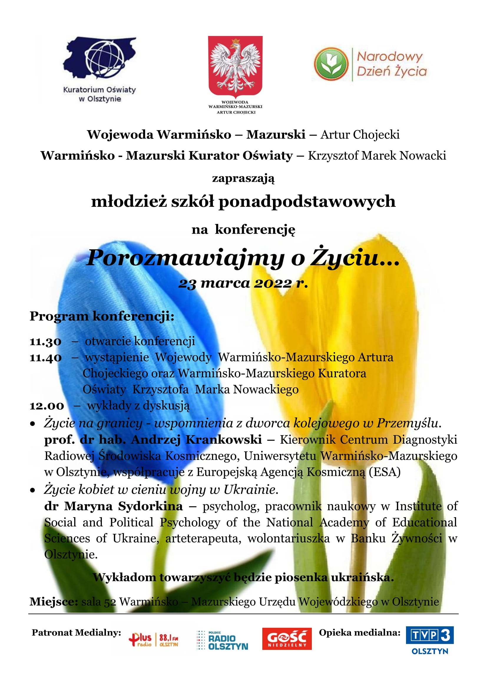 24 marca obchodzimy Narodowy Dzień Życia, który jest okazją do rozmów o życiu z udziałem młodzieży. Słyużyć ma temu między innymi konferencja organizowana od 2018 roku przez Wojewodę Warmińsko-Mazurskiego. W ubiegłym roku, ze względu na pandemię, odbyła się live on-line na FB. W tym roku spotkanie z młodzieżą odbędzie się w tradycyjnej formie. Tematem przewodnim będzie życie w cieniu wojny w Ukrainie. Wśród zaproszonych gości znaleźli się: prof. dr hab. Andrzej Krankowski z Uniwersytetu Warmińsko-Mazurskiego oraz dr Marina Sydorkina, psycholog, pracownik naukowy w Institute of Social and Political Psychology of the National Academy of Educational Sciences of Ukraine, obecnie uchodźca. Spotkaniu towarzyszyć będzie piosenka ukraińska.