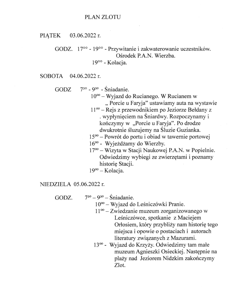 Lądem i wodą organizatorzy wraz z uczestnikami zlotu zagłebią się w lasy Puszczy Piskiej otulającej brzegi jezior Nidzkiego i Bełdany, w krainę ukochaną przez ludzi pióra: Ernsta Wiecherta, Agnieszkę Osiecką, Konstantego Ildefonsa Gałczyńskiego,czy Melchiora Wańkowicza.
