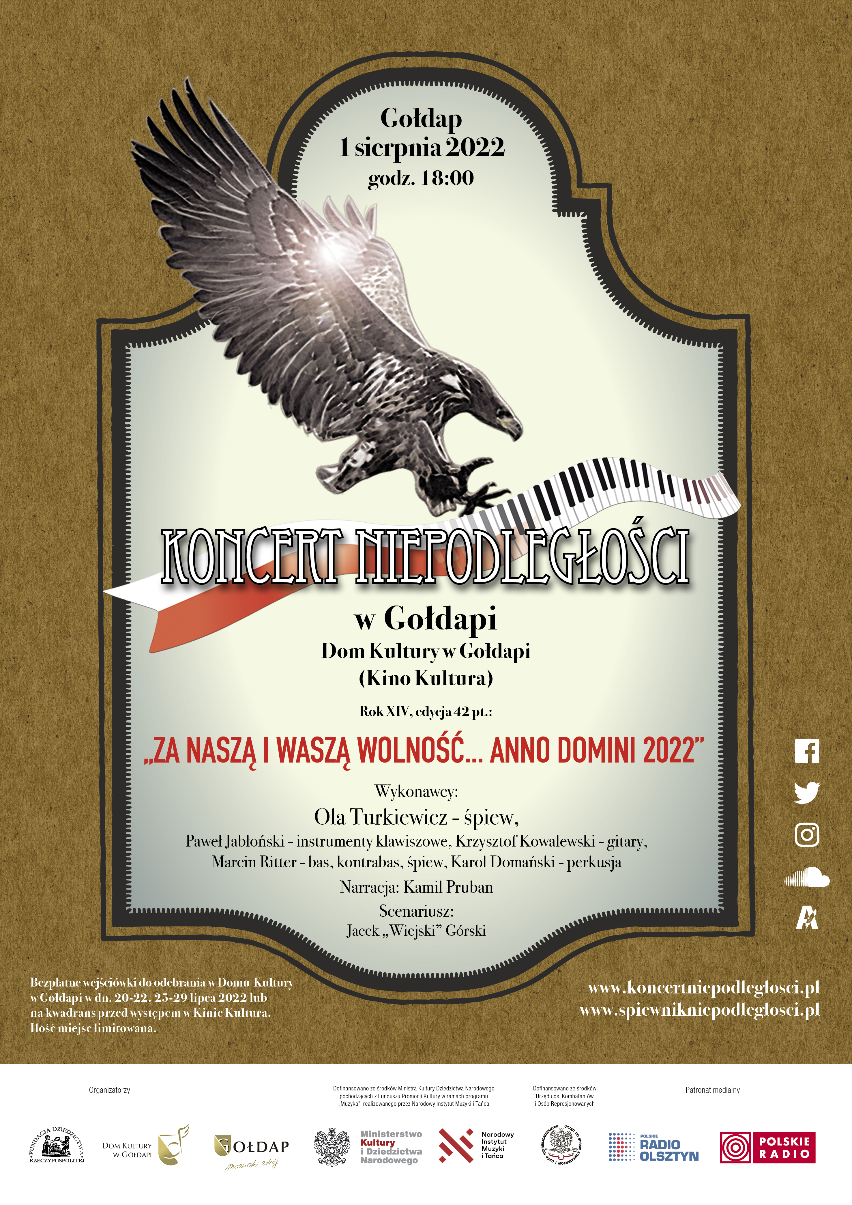 1 sierpnia 2022 roku, w 78. rocznicę wybuchu Powstania Warszawskiego, w Gołdapi, odbędzie się druga mazurska edycja Koncertu Niepodległości „Za Naszą i Waszą wolność… Anno Domini 2022”. Koncert Niepodległości to projekt, którego realizację rozpoczęto 14 lat temu. Jego twórcami są polsko-kanadyjska wokalistka i kompozytorka Ola Turkiewicz oraz Jacek ”Wiejski” Górski, scenarzysta, reżyser i producent. Premiera Koncertu Niepodległości miała miejsce w 2009 roku w Muzeum Powstania Warszawskiego. Obecny dorobek Koncertu Niepodległości to 42 edycje w Polsce i za granicą, blisko 190 kompozycji i aranżacji oraz ponad 20 odrębnych scenariuszy. Projekt tworzy międzynarodowy zespół muzyków sesyjnych, w którego skład weszło przez lata ponad 230 artystów z Polski, Kanady, Australii, Wielkiej Brytanii, Ukrainy i Armenii. Występując pod nazwą Polish Independence Concert we wrześniu 2019 roku zespół zaprezentował anglojęzyczną edycję „Poland” w Bazie NATO w Ādaži na Łotwie. Ponadto zrealizowano dwujęzyczne edycje międzynarodowe w Australii i w Kanadzie, na Litwie i na Łotwie.
