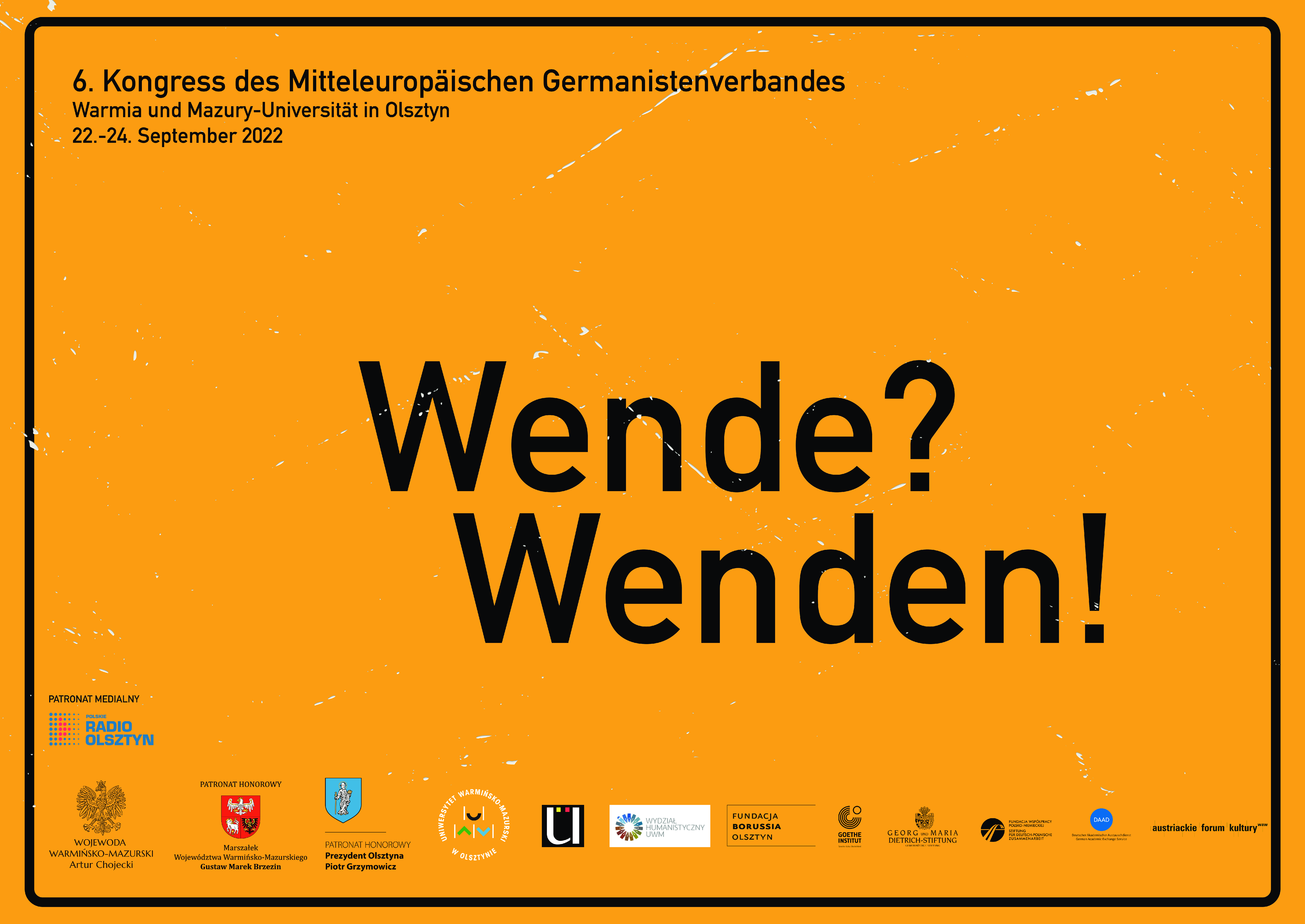 W dniach 22-24 września 2022 roku Katedra Języka Niemieckiego oraz Katedra Literatury i Kultury Krajów Niemieckojęzycznych UWM w Olsztynie organizują wraz ze Stowarzyszeniem Germanistów Europy Środkowej (Mitteleuropäischer Germanistenverband – MGV) 6. Międzynarodowy Kongres Stowarzyszenia Germanistów Europy Środkowej pt. „WENDE? WENDEN!”