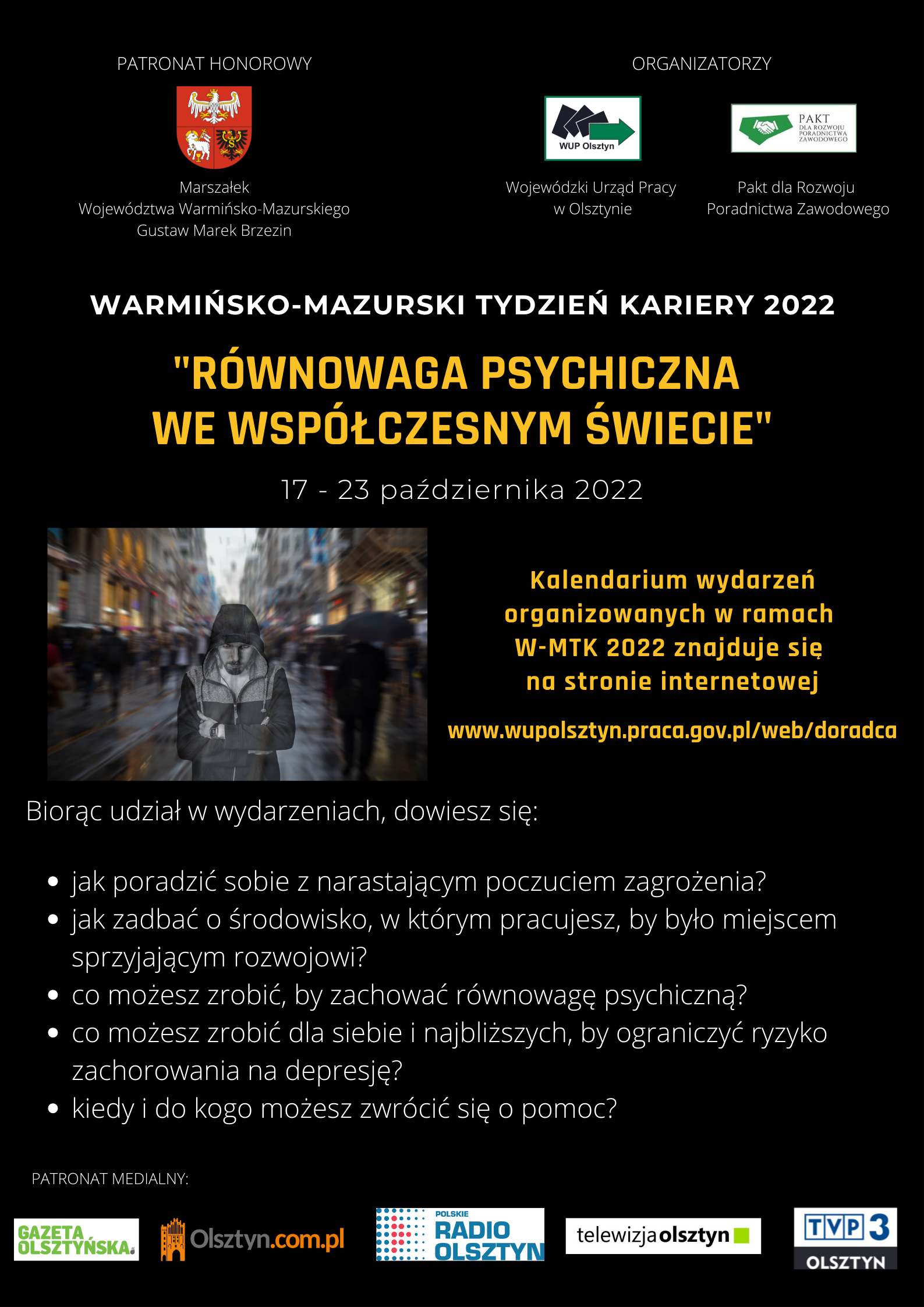 Warmińsko-Mazurski Tydzień Kariery 2022 zostanie zainaugurowany wojewódzką konferencją pn. „W poszukiwaniu utraconej równowagi – o kondycji psychicznej we współczesnym świecie”, która odbędzie się 17 października 2022 w Olsztynie.