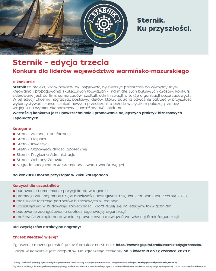 Po raz trzeci organizatorzy zapraszają liderów województwa warmińsko-mazurskiego do udziału w konkursie. W tym roku każda z kategorii będzie miała odniesienie do sytuacji naszych wschodnich sąsiadów. Sternik to projekt, który powstał by inspirować, by tworzyć przestrzeń do wymiany myśli, kreowania i propagowania skutecznych rozwiązań - na miarę burzliwych czasów.