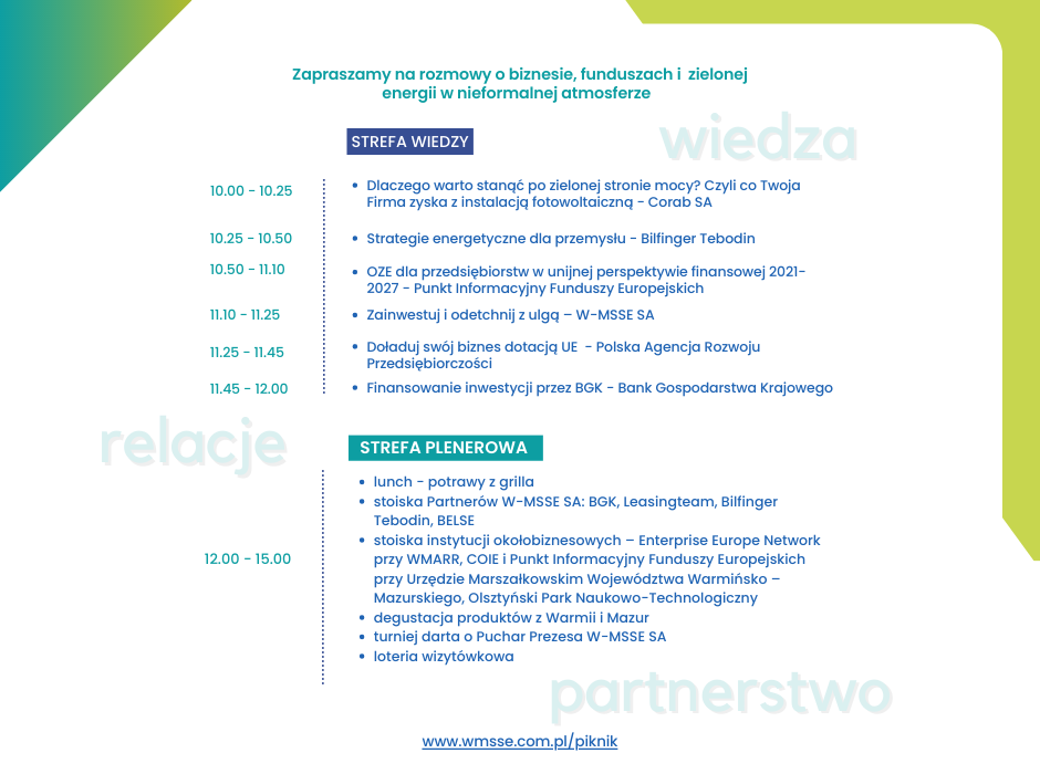 Piknik będzie doskonałą okazją do spotkania w wyjątkowej, nieformalnej atmosferze, poszerzenia wiedzy z zakresu instrumentów wsparcia przedsiębiorczości oraz korzystania z odnawialnych źródeł energii, wymiany doświadczeń oraz nawiązania nowych relacji biznesowych lub rozwinięcia już istniejących.