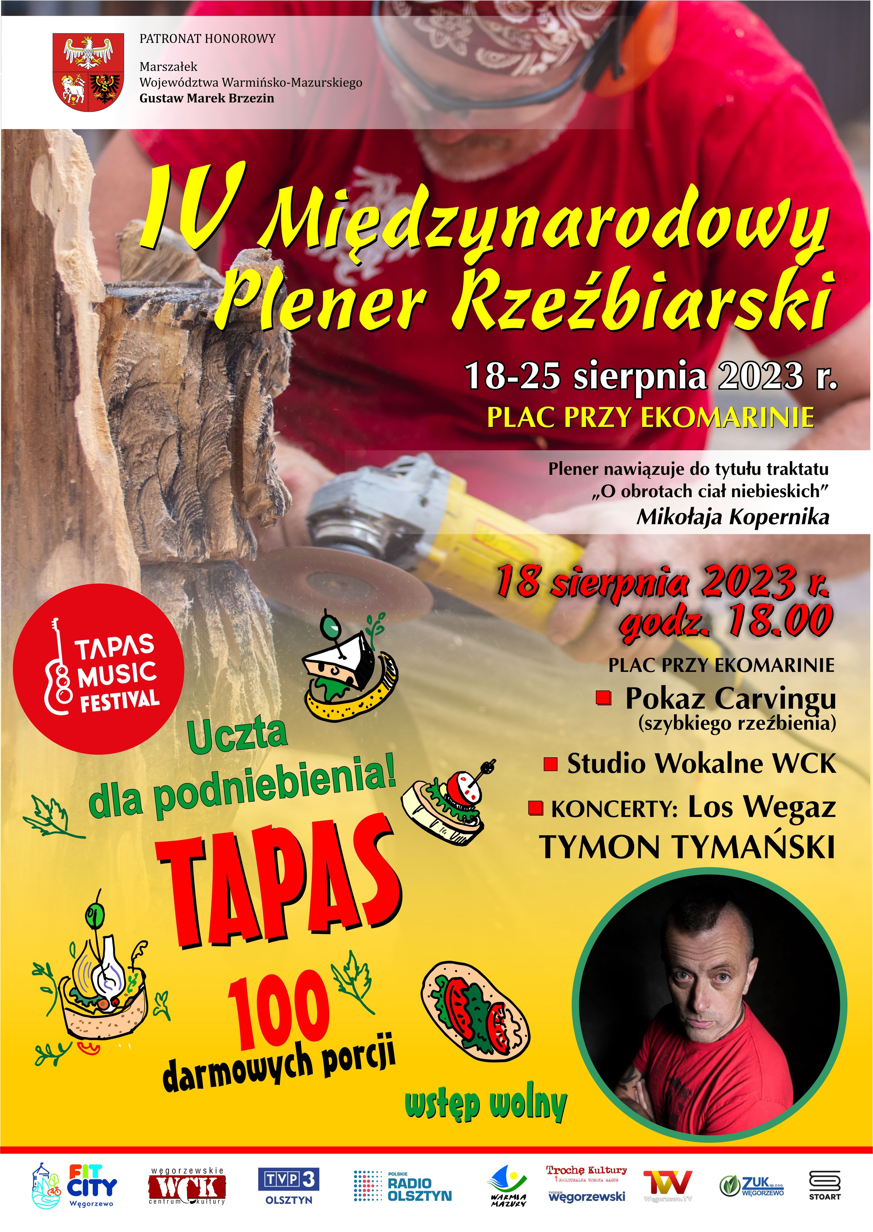 18 sierpnia o godz. 18.00 rozpocznie się koncert inauguracyjny pleneru, podczas którego odbędą się pokazy rzeźbienia piłą, występy solistów Studia Wokalnego WCK oraz koncerty zespołu Los Wegaz i gwiazdy wieczoru – Tymona Tymańskiego.