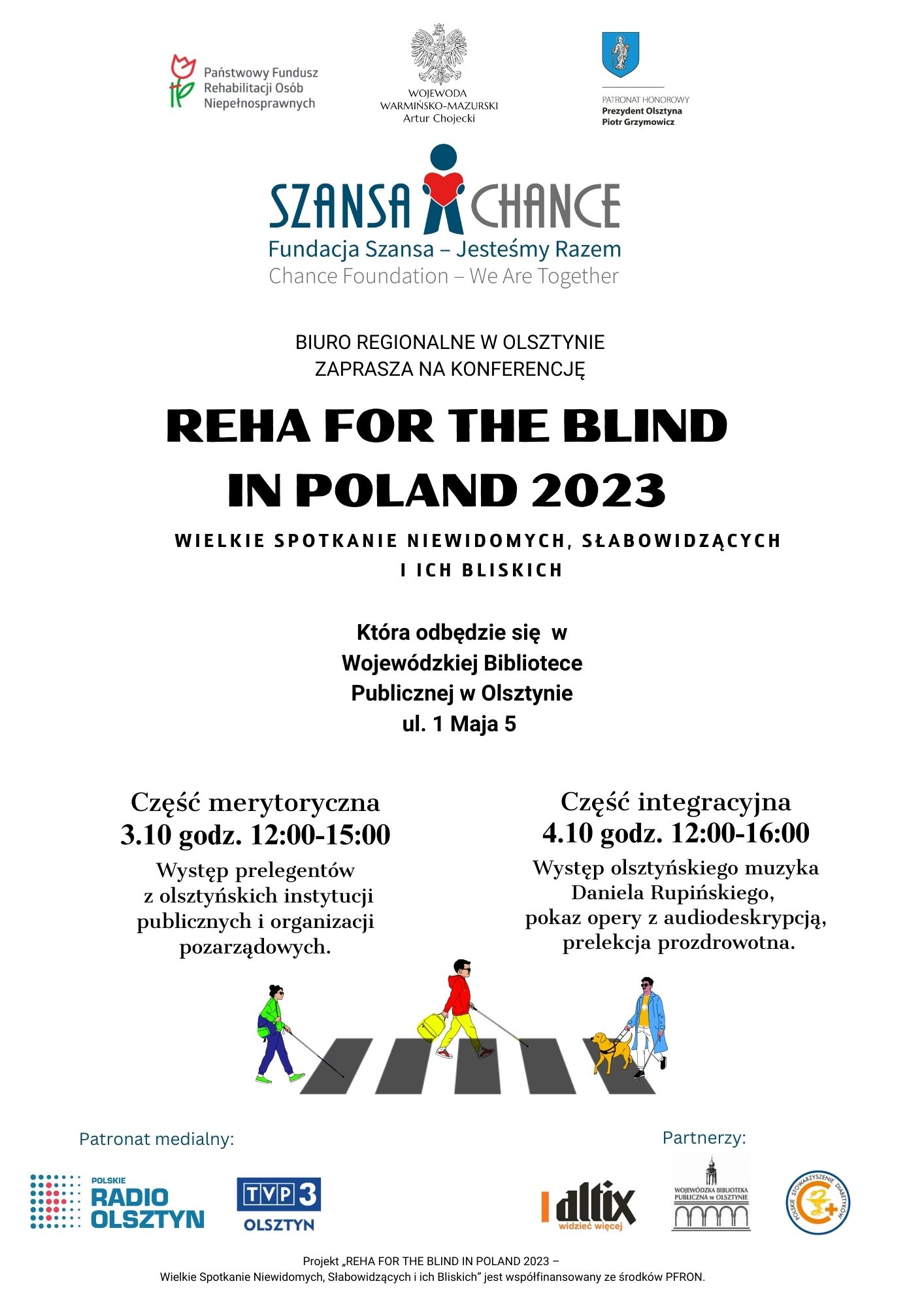 Ogólnopolska odsłona Konferencji Reha For The Blind 2023 in Poland odbyła się w Warszawie równocześnie z międzynarodową konferencją IMC 18 (18 th International Mobility Conference). Tematem przewodnim konferencji było: „Informacja skutkująca mobilnością i umiejętnościami”. Wydarzenie zgromadziło setki osób zainteresowanych aktualnymi problemami niepełnosprawnych wzrokowo i nowoczesnymi rozwiązaniami. Co roku staramy się, aby to Wielkie Spotkanie miało niepowtarzalny charakter i pomogło w rehabilitacji jak największej liczbie odbiorców.