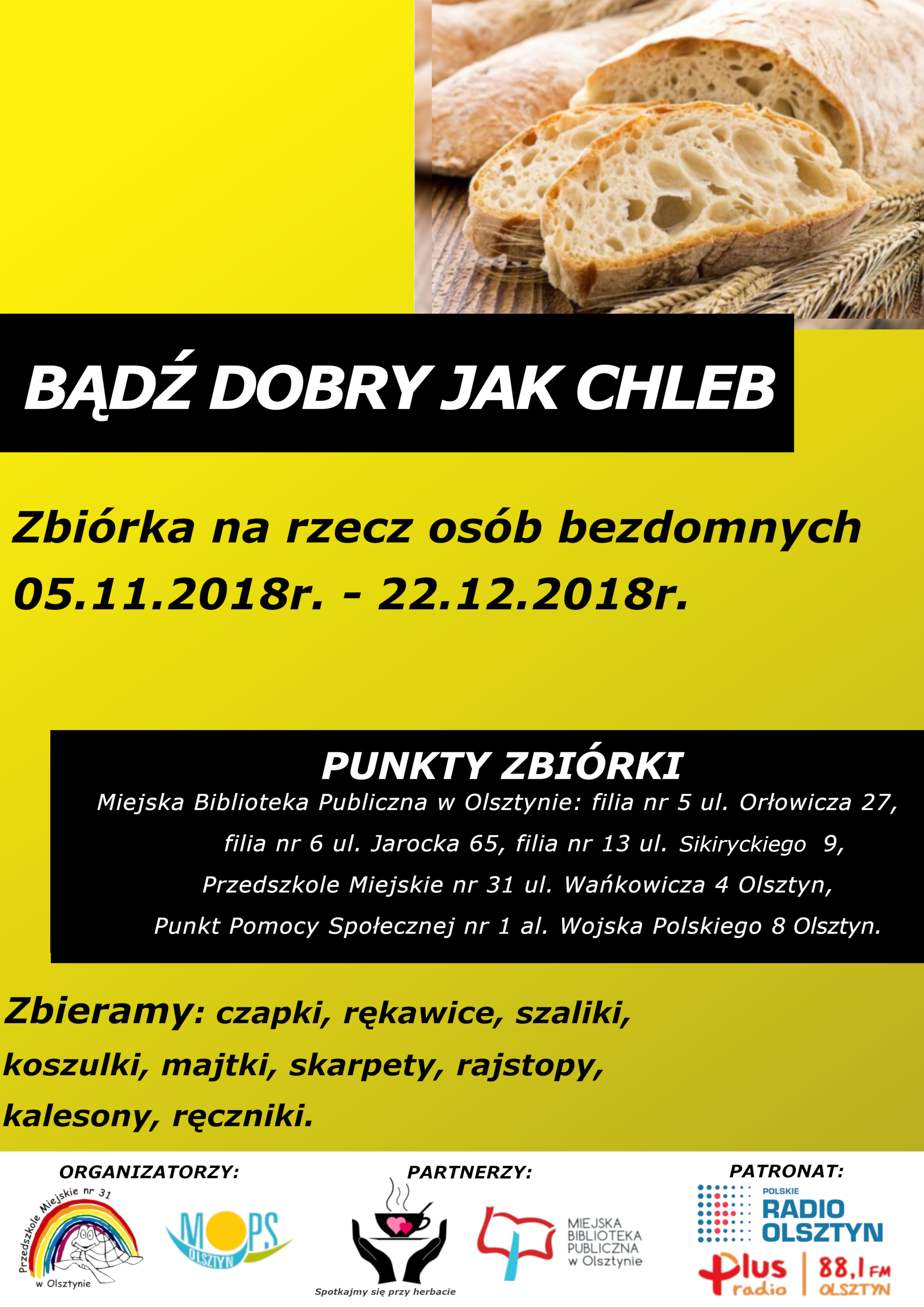 Problem bezdomności istnieje przez cały rok, ale to okres jesienno-zimowy jest czasem najtrudniejszym dla osób pozostających bez dachu nad głową. Jednak wystarczy niewielka pomoc, aby bezdomni mniej odczuwali skutki zimowej aury.Z propozycją takiej pomocy już po raz drugi wyszło Przedszkole Miejskie nr 31 w Olsztynie przy współpracy Miejskiego Ośrodka Pomocy Społecznej w Olsztynie, organizując zbiórkę darów pod hasłem „Bądź dobry jak chleb". Przedszkolaki i grono pedagogiczne placówki zachęcają wszystkich ludzi dobrego serca do włączenia się w akcję, która potrwa do 22 grudnia. Do siedziby przedszkola przy ul. Wańkowicza 24 w Olsztynie, a także do filii nr 5, 6 i 13 Miejskiej Biblioteki Publicznej, oraz do Punktu Pomocy Społecznej nr 1 w Olsztynie można przynosić czapki, rękawiczki, szaliki, koszulki, majtki, skarpety, ciepłe rajstopy, kalesony i ręczniki, które jeszcze przed świętami zostaną przekazane osobom bezdomnym z Olsztyna i okolic.
