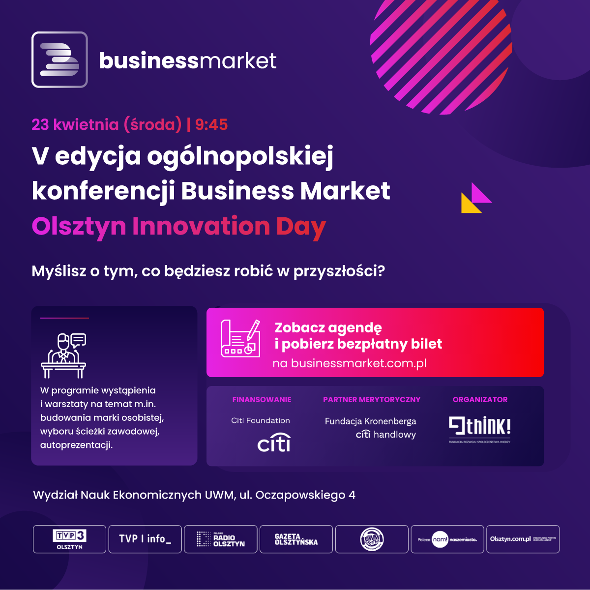Olsztyn dołącza do mapy miast wspierających młodą przedsiębiorczość. Już 23 kwietnia 2025 r. na Wydziale Nauk Ekonomicznych Uniwersytetu Warmińsko-Mazurskiego odbędzie się „Business Market. Olsztyn Innovation Day” – lokalna odsłona ogólnopolskiej konferencji Business Market, organizowanej przez Fundację Think!, działającej na rzecz rozwoju przedsiębiorczości i edukacji z obszaru finansów. Choć to już piąta edycja wydarzenia, które od lat wspiera młodych ludzi w rozwoju przedsiębiorczości i kompetencji zawodowych, to po raz pierwszy zawita ono do Olsztyna.