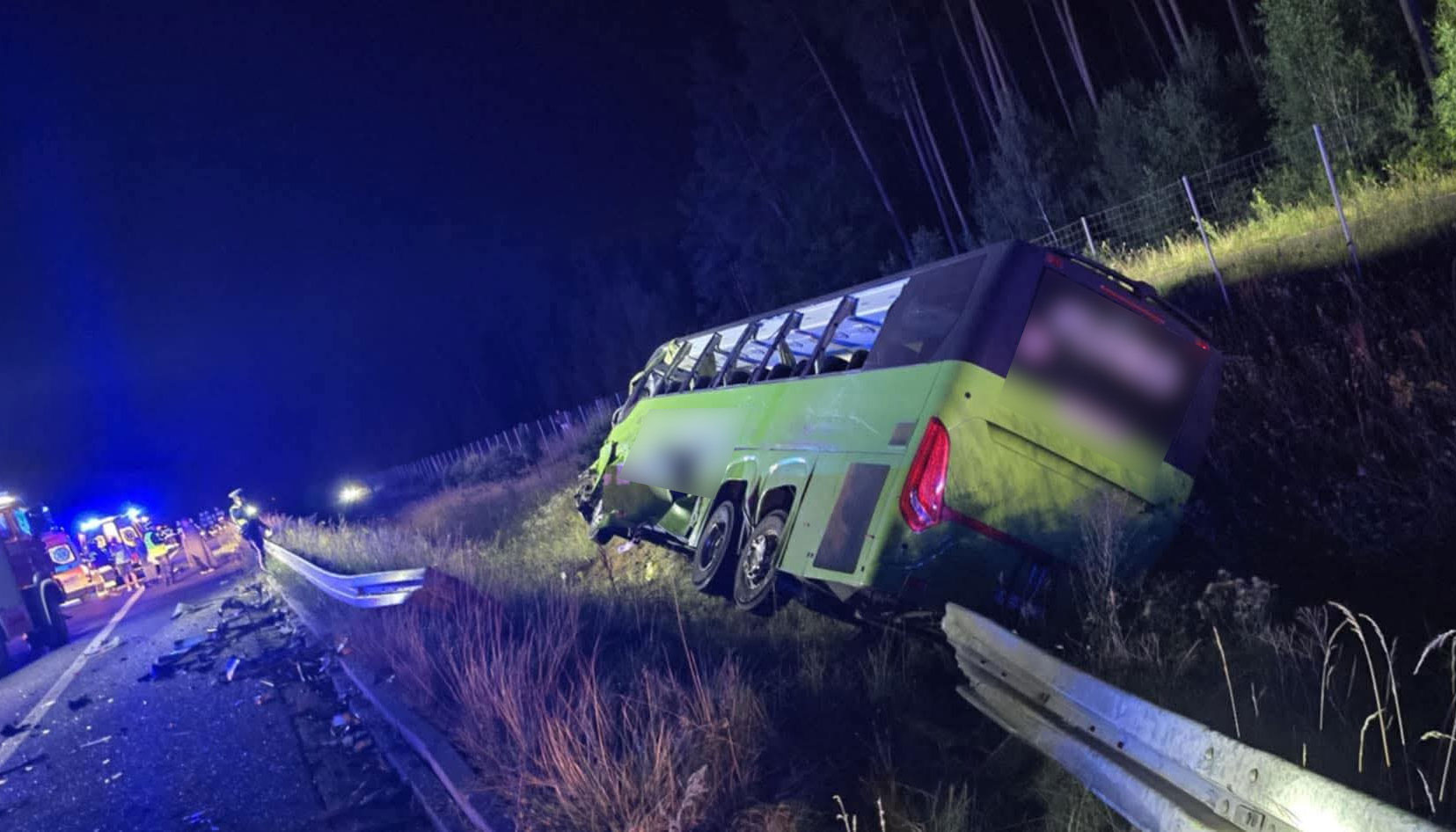 Do wypadku trzech pojazdów doszło po godz. 21.00. Samochód ciężarowy z naczepą najechał na bariery i wypadł na jezdnię w przeciwnym kierunku ruchu, zderzając się z autokarem i autem osobowym. Ciężarówka przewożąca zboże zapaliła się, a ładunek wysypał się na drogę. Dwaj kierowcy w ciężkim stanie trafili do szpitala. Na badania zabranych zostało też pięciu pasażerów autobusu.