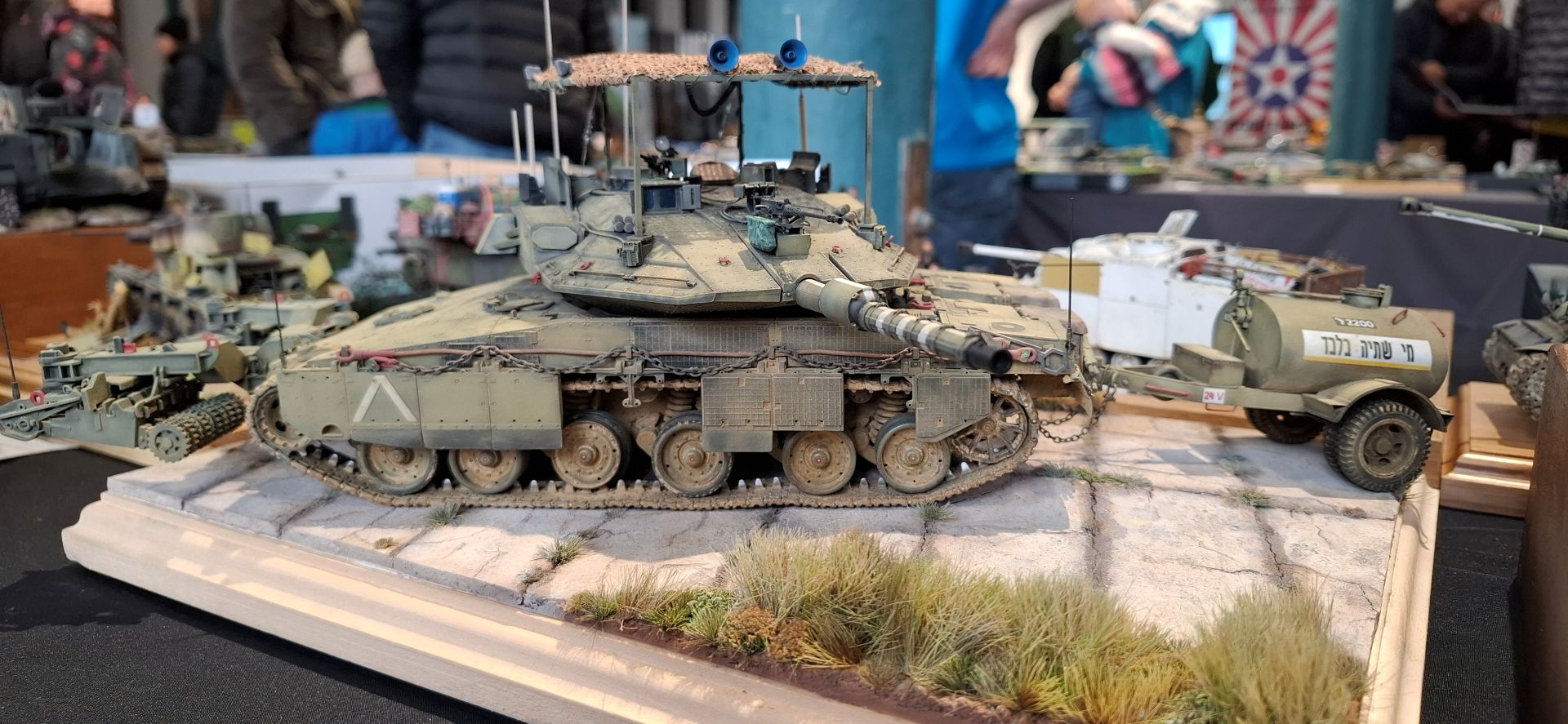 Bartłomiej Berg z Inowrocławskiego Stowarzyszenia Modelarzy Redukcyjnych przywiózł do Olsztyna współczesny izraelski czołg podstawowy Merkawa Mk4 w najnowszej wersji, używany podczas konfliktu „Operacja Żelazne Miecze” w Strefie Gazy. – Czołg posiada z przodu trał przeciwminowy, naciskowy, do detonacji min, żeby nie wysadziło pojazdu, z tyłu ciągnie przyczepę na wodę – opisuje swój imponujący model pan Bartłomiej. Jak zaznacza, choć baza modelu jest „pudełkowa”, to niewiele z niej zostało, a większość elementów została dorobiona ręcznie, przy użyciu druku 3D i odlewów żywicznych na podstawie setek zdjęć zdobytych od znajomych z Izraela. Jego pasja do izraelskiej broni pancernej wynika z nietypowych rozwiązań konstrukcyjnych stosowanych przez tamtejszych producentów.